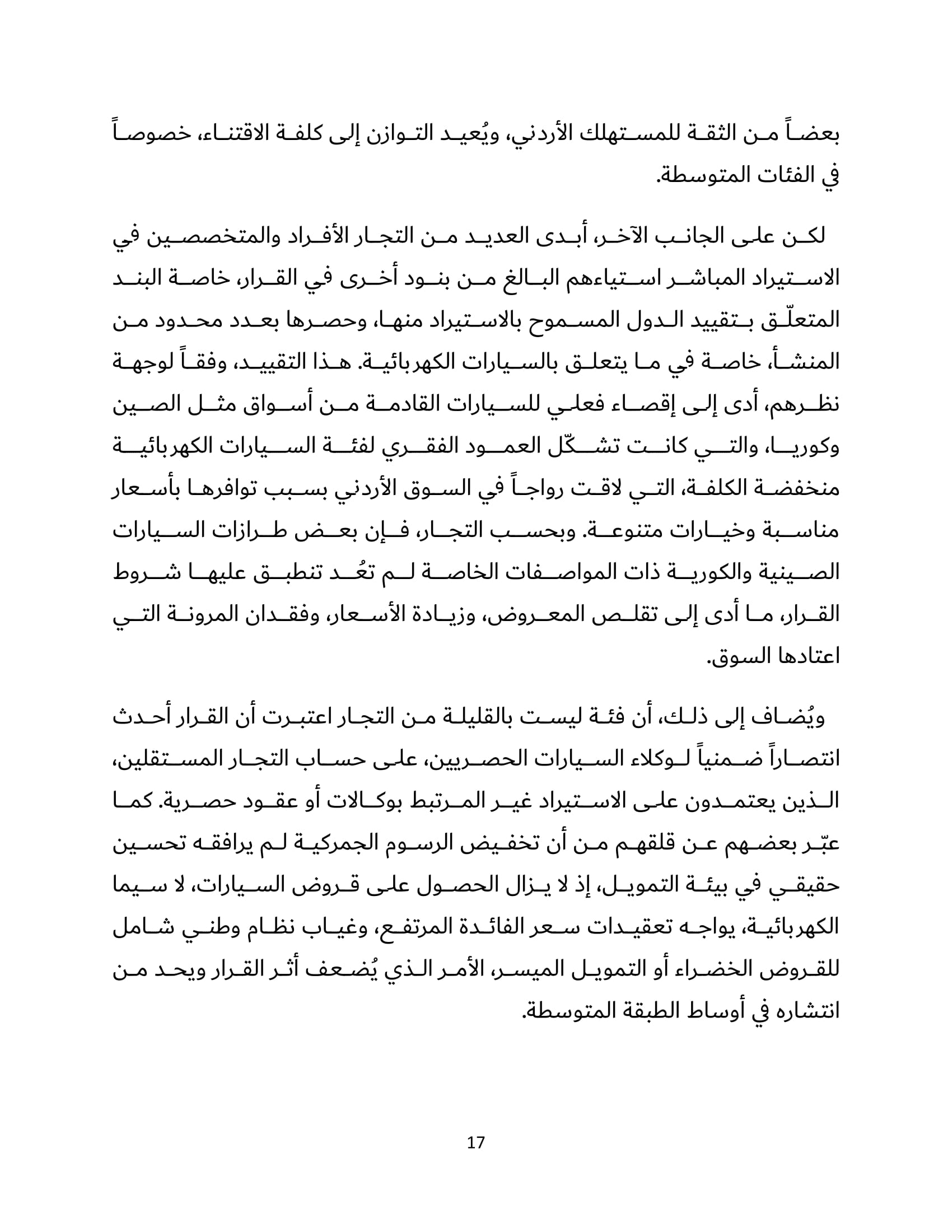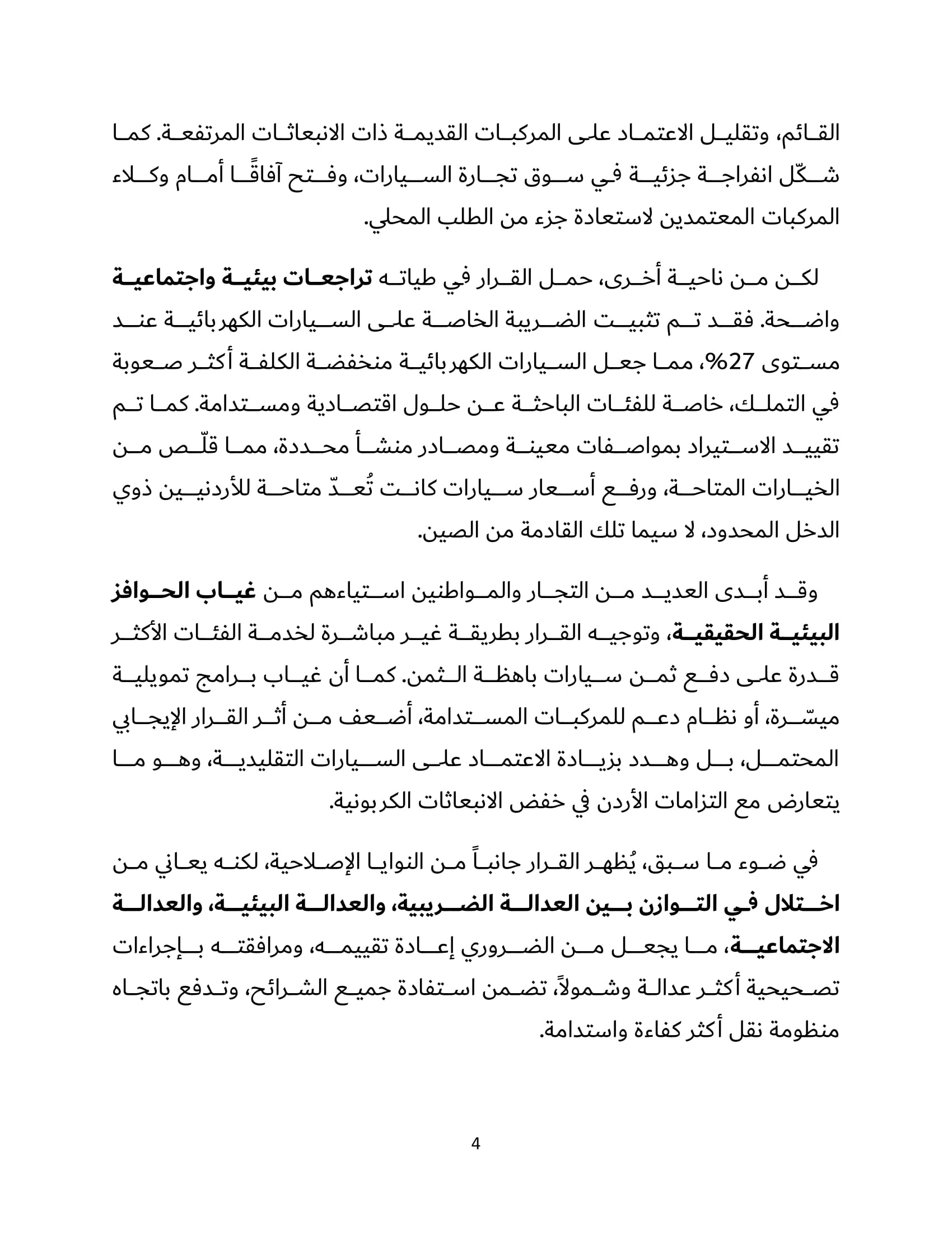 وأكد الحزب، في الورقة الصادرة اليوم، أن قطاع المركبات في الأردن ليس ترفا استهلاكياً، بل جزء أساسي من منظومة الحياة الحضرية وشبه الحضرية، ما يجعل من أي تعديل في بنيته قرارا ذا أبعاد اجتماعية واقتصادية وبيئية عميقة.