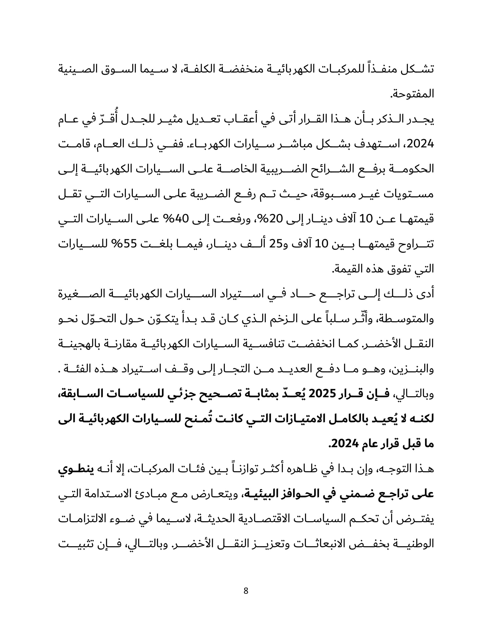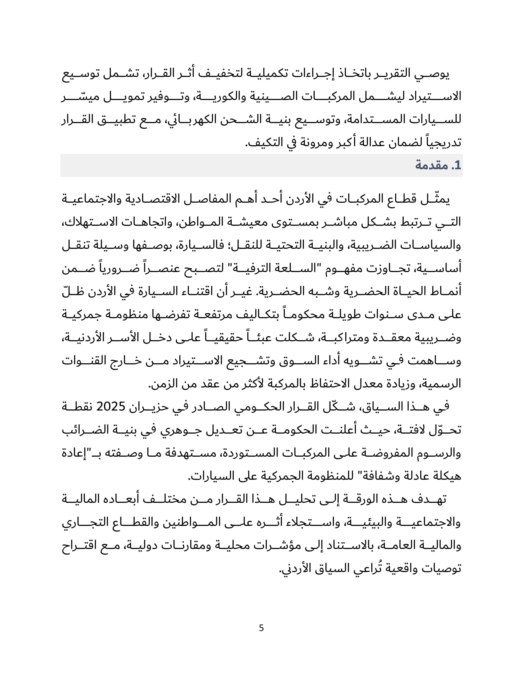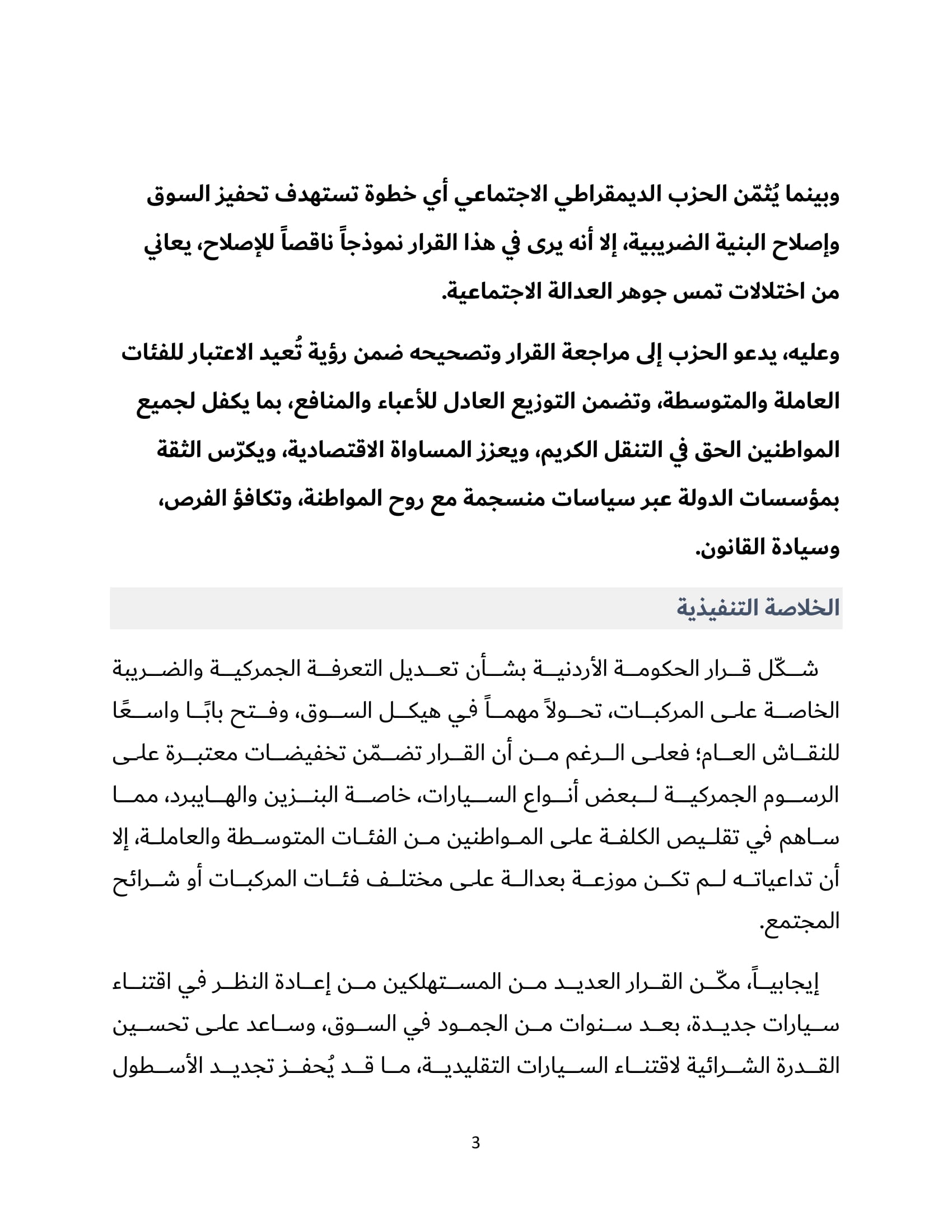 ودعا الحزب إلى مراجعة القرار ضمن رؤية تُعيد الاعتبار للفئات العاملة والمتوسطة، وتضمن التوزيع العادل للأعباء والمنافع، بما يرسخ الحق في التنقل الكريم، ويعزز المساواة الاقتصادية والثقة بسياسات الدولة، على قاعدة المواطنة وتكافؤ الفرص وسيادة القانون.
