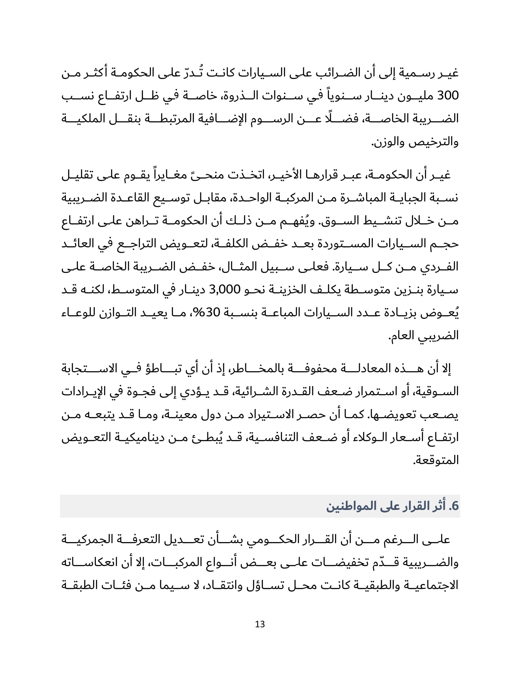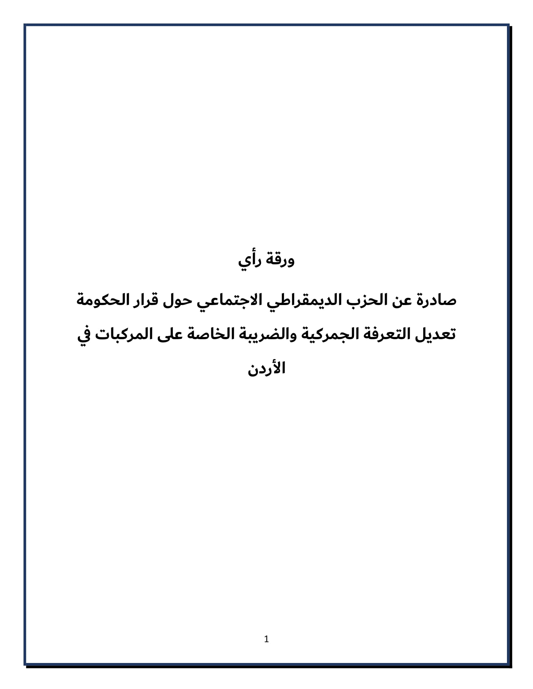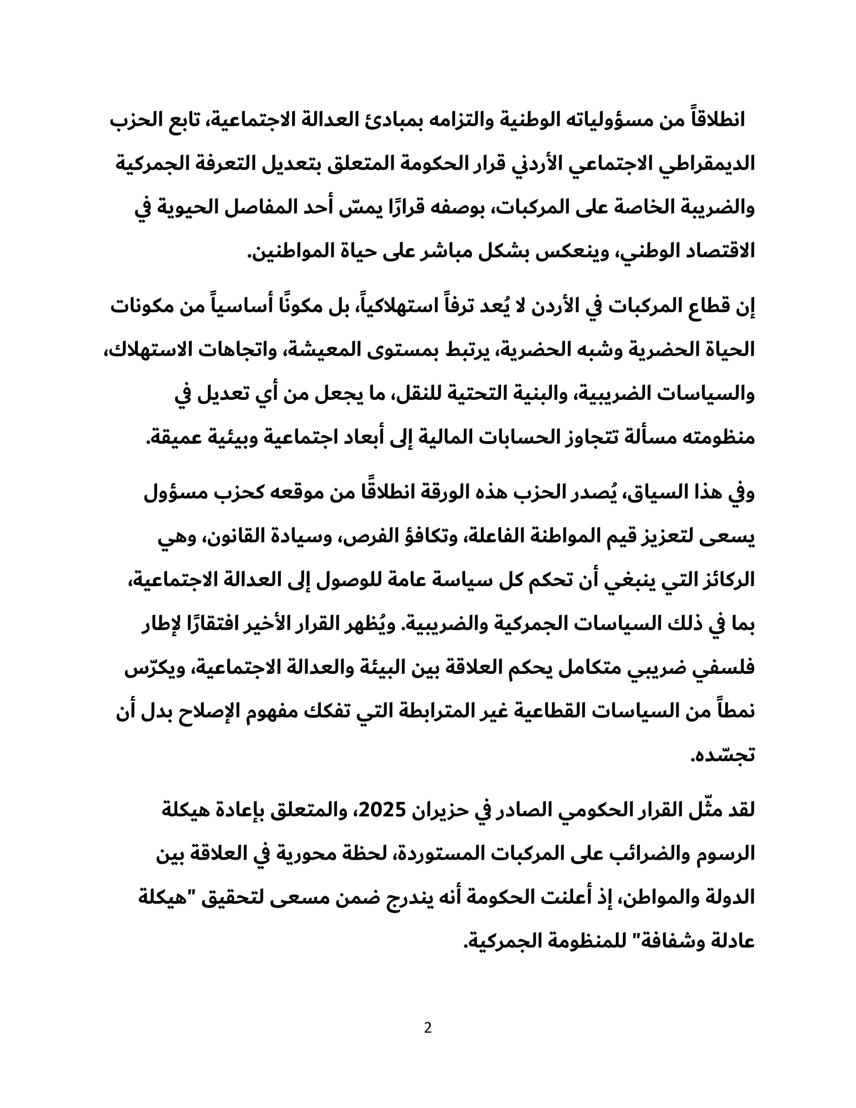 عمون - أصدر الحزب الديمقراطي الاجتماعي الأردني ورقة رأي تناول فيها بالتحليل العلمي قرار الحكومة المتعلق بتعديل التعرفة الجمركية والضريبة الخاصة على المركبات، واصفًا إياه بأنه "بحاجة إلى إطار فلسفي ضريبي متكامل" ويكرّس سياسات قطاعية غير مترابطة.