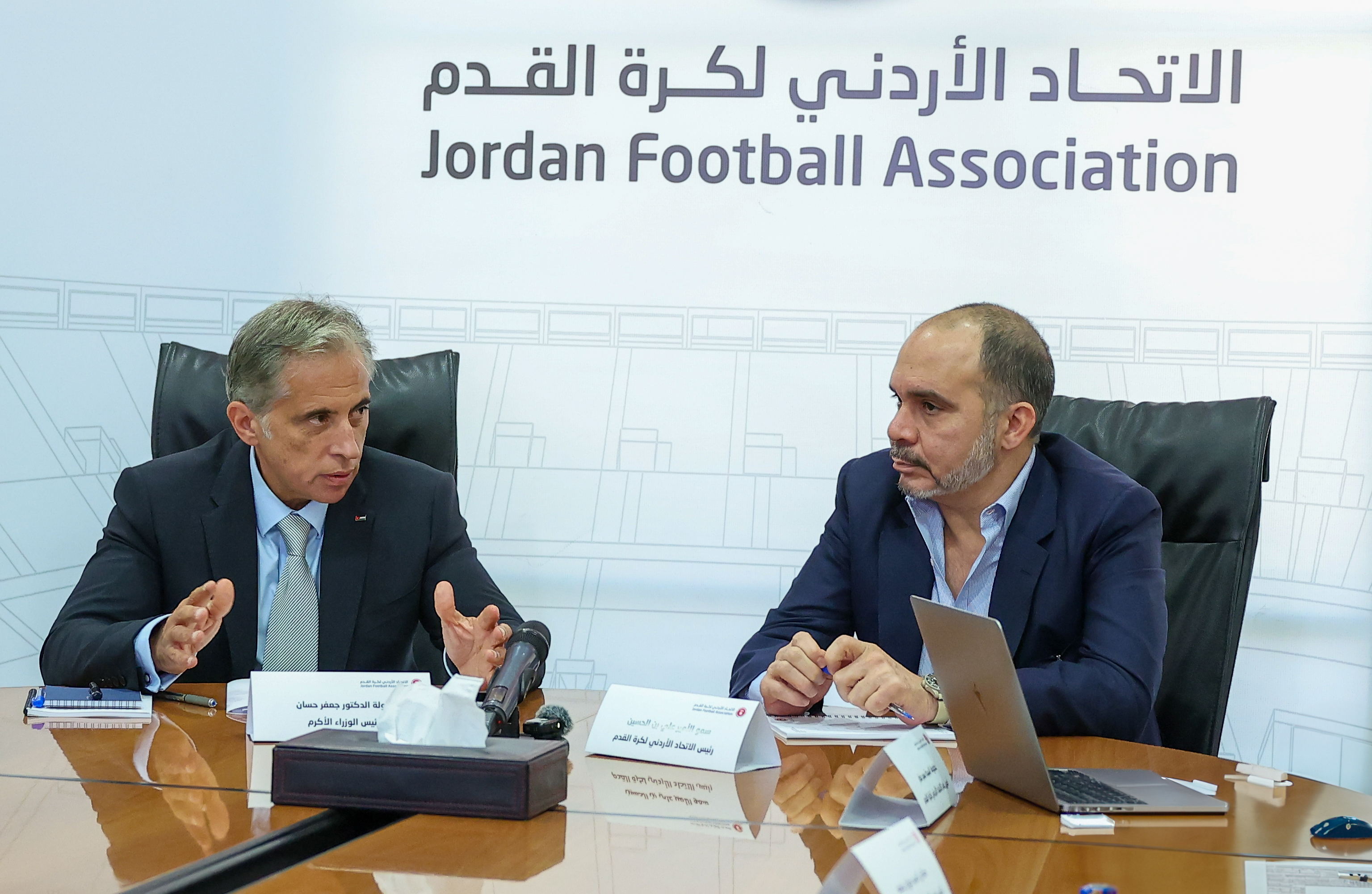 عمون - ترأس سموّ الأمير علي بن الحسين، رئيس الاتحاد الأردني لكرة القدم، اليوم الأربعاء اجتماعاً للاتحاد، استضاف فيه رئيس الوزراء الدكتور جعفر حسَّان، جرى خلاله التأكيد على أهميَّة تكاتف الجهود للبناء على الإنجاز التاريخي الذي حققه المنتخب الوطني لكرة القدم بتأهله لكأس العالم، واستثماره كقصَّة نجاح لتحفيز الشَّباب واستدامة هذه الإنجازات.