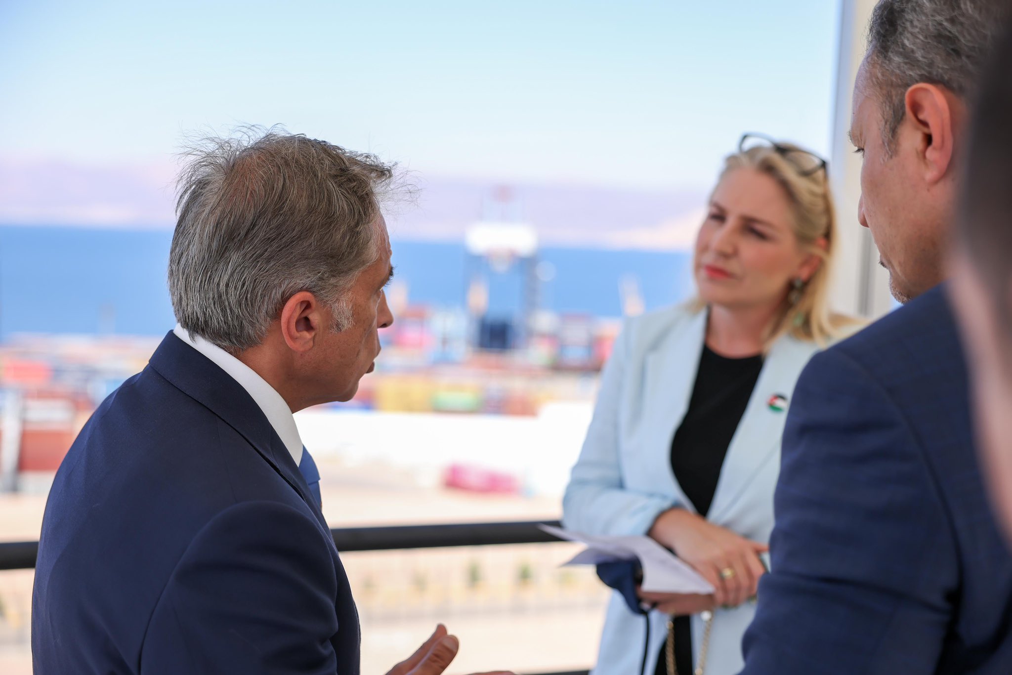 كما اطلع رئيس الوزراء على سير العمل في ميناء العقبة الجديد الذي يضم 9 أرصفة من بينها رصيفان مخصَّصان لصوامع الحبوب، والذي تمَّ تطويره وتوسيع قدرته على المناولة لتبلغ 6 ملايين طن سنويَّاً، ساهمت في نمو عمليات المناولة بنسبة 9% مقارنة مع العام الماضي.