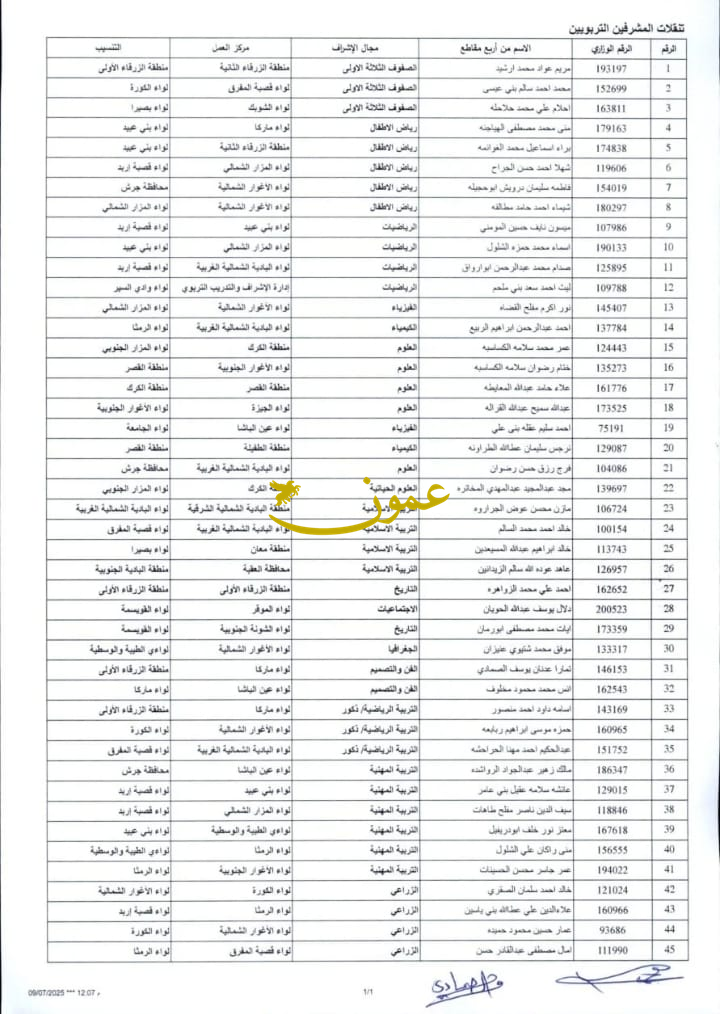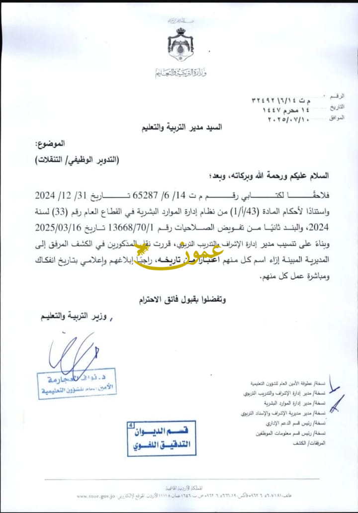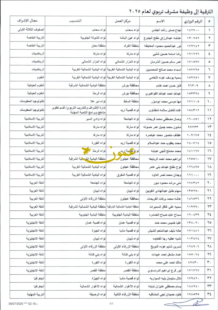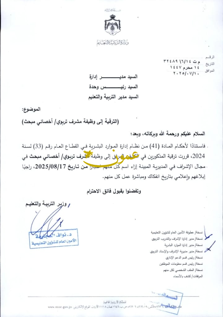 عمون - قررت وزارة التربية والتعليم، ترقية عدد من موظفيها إلى وظيفة مشرف تربوي / اخصائي مبحث في مجال الاشراف في عدد من المديريات اعتبارا من 17/8/2025.