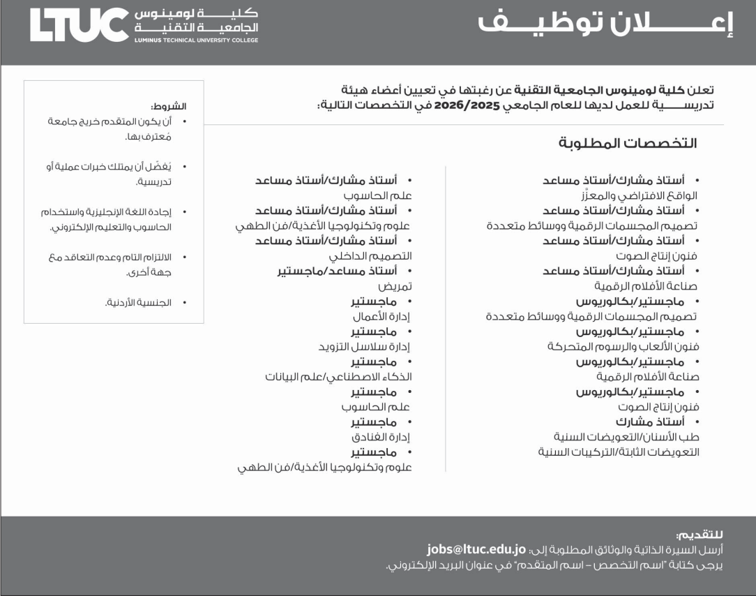 كلية لومينوس الجامعية التقنية بحاجة لتعيين اعضاء هيئة تدريسية