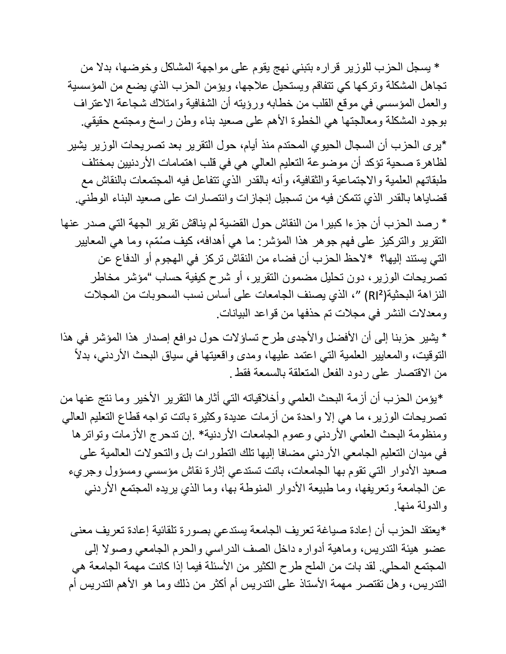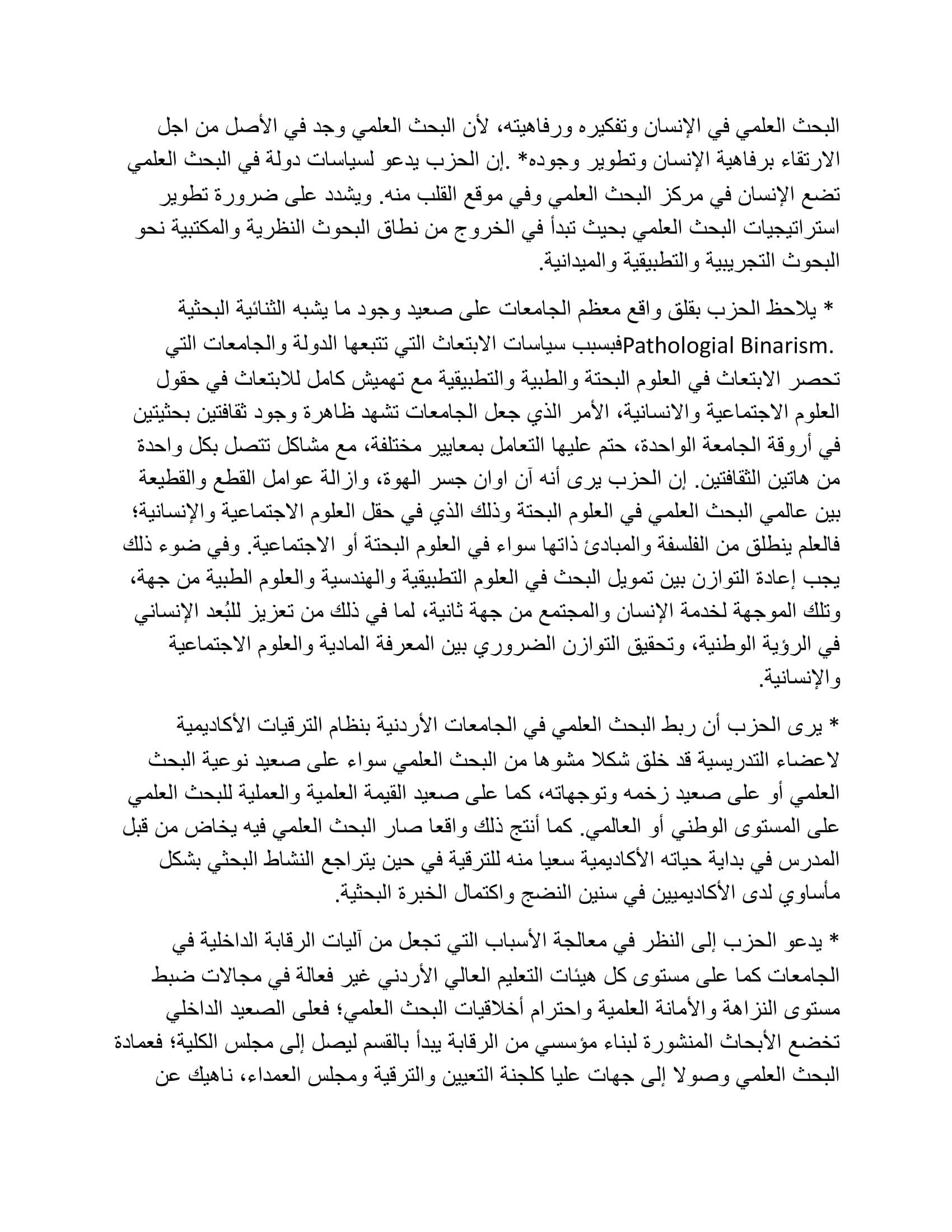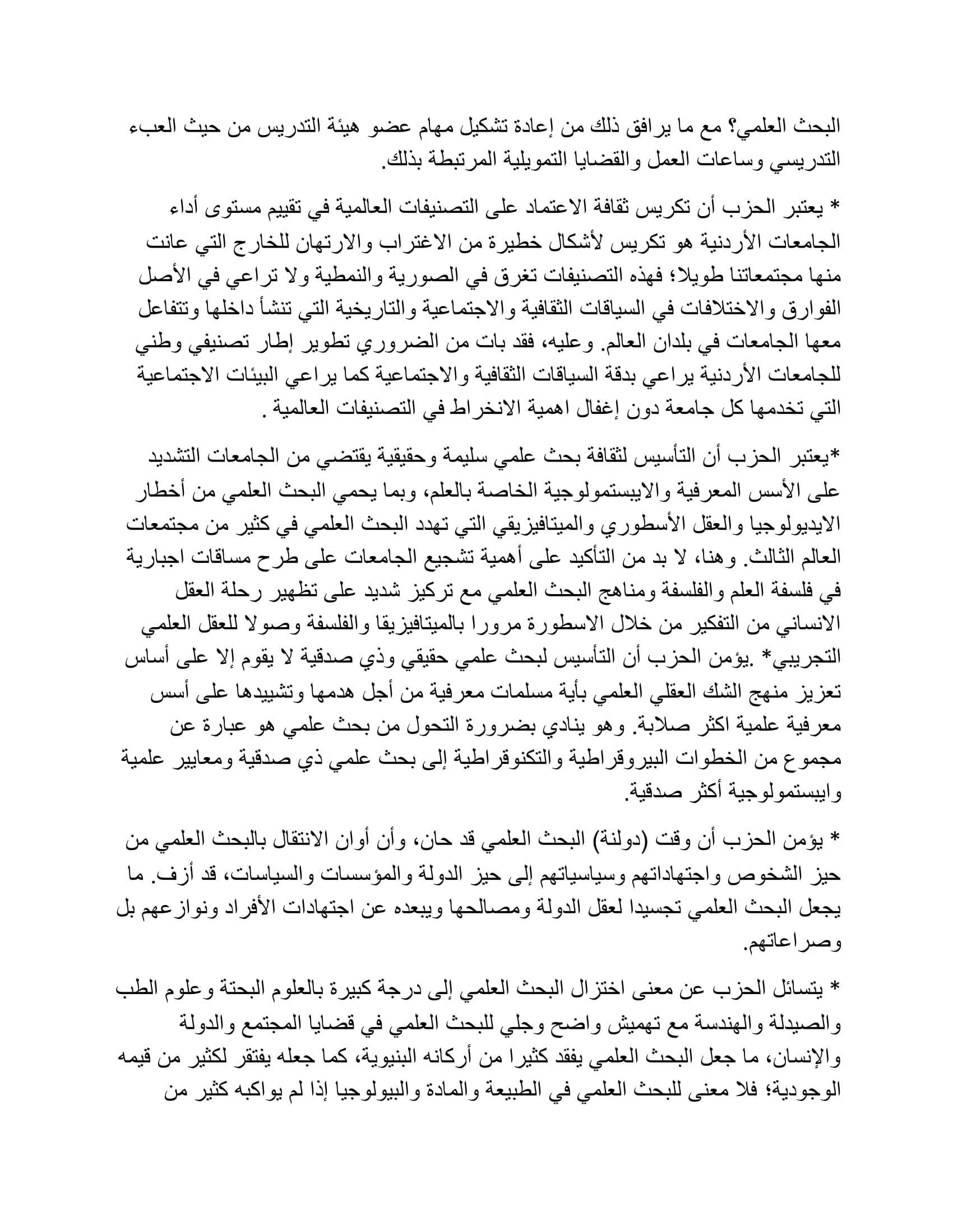 وأشار الحزب إلى أهمية "دولنة البحث العلمي"، عبر خلق أطر مؤسسية مستقلة تراقب وتقيم الأداء الأكاديمي بمعزل عن الضغوط الإدارية أو الحسابات الشخصية، بما يضمن استقلالية الجامعات وتكافؤ الفرص في التقييم العلمي.