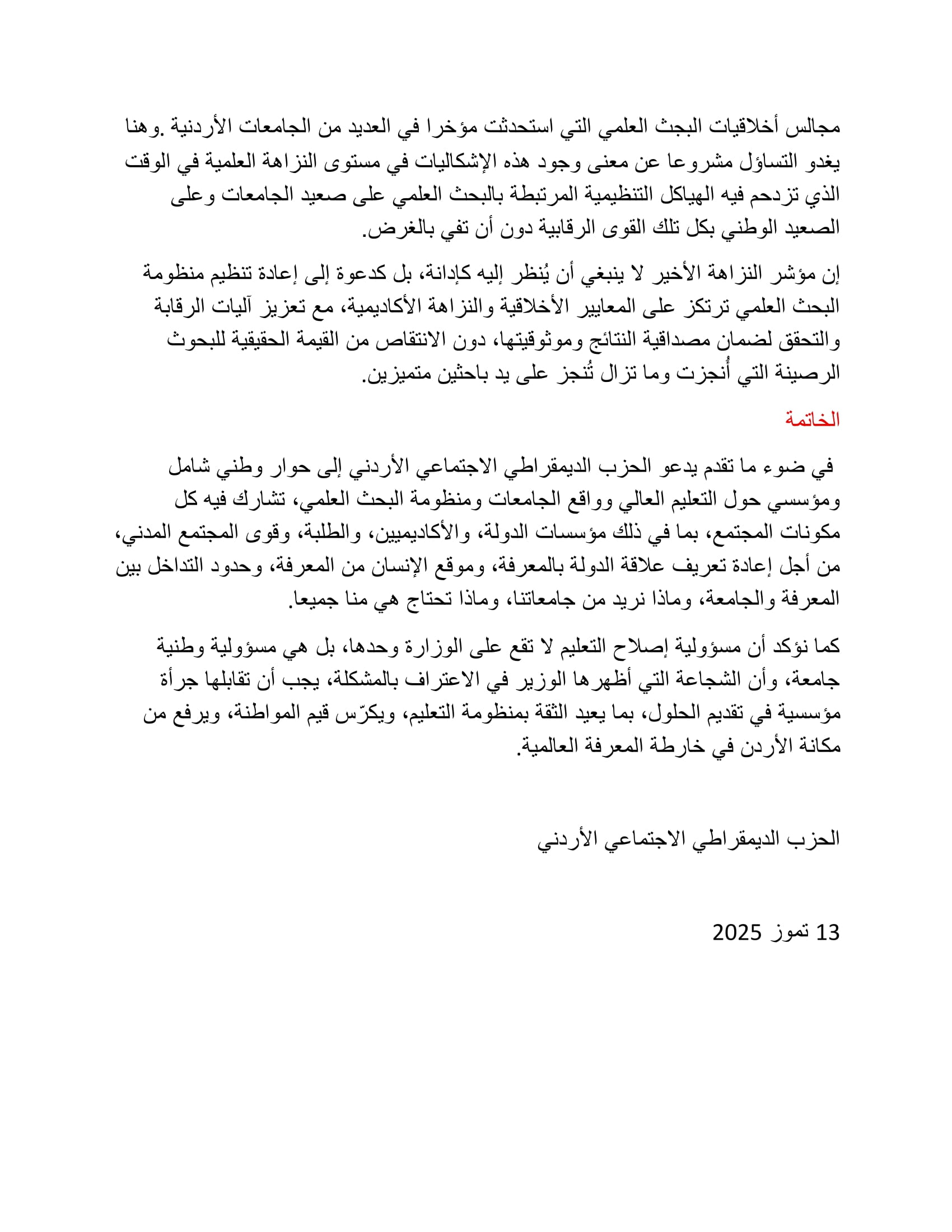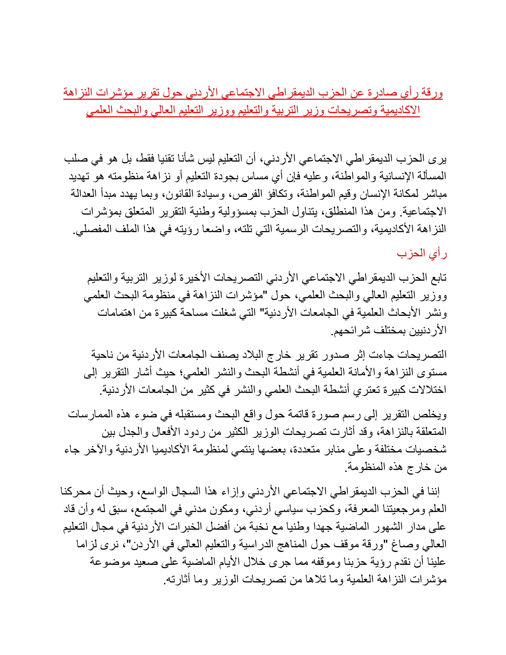 عمون - أصدر الحزب الديمقراطي الاجتماعي الأردني، الأحد، ورقة رأي تناول فيها تقرير مؤشرات النزاهة الأكاديمية في الجامعات الأردنية الصادر خارج البلاد مؤخرا، وتصريحات وزير التربية والتعليم ووزير التعليم العالي والبحث العلمي المتعلقة بواقع البحث العلمي في الأردن.