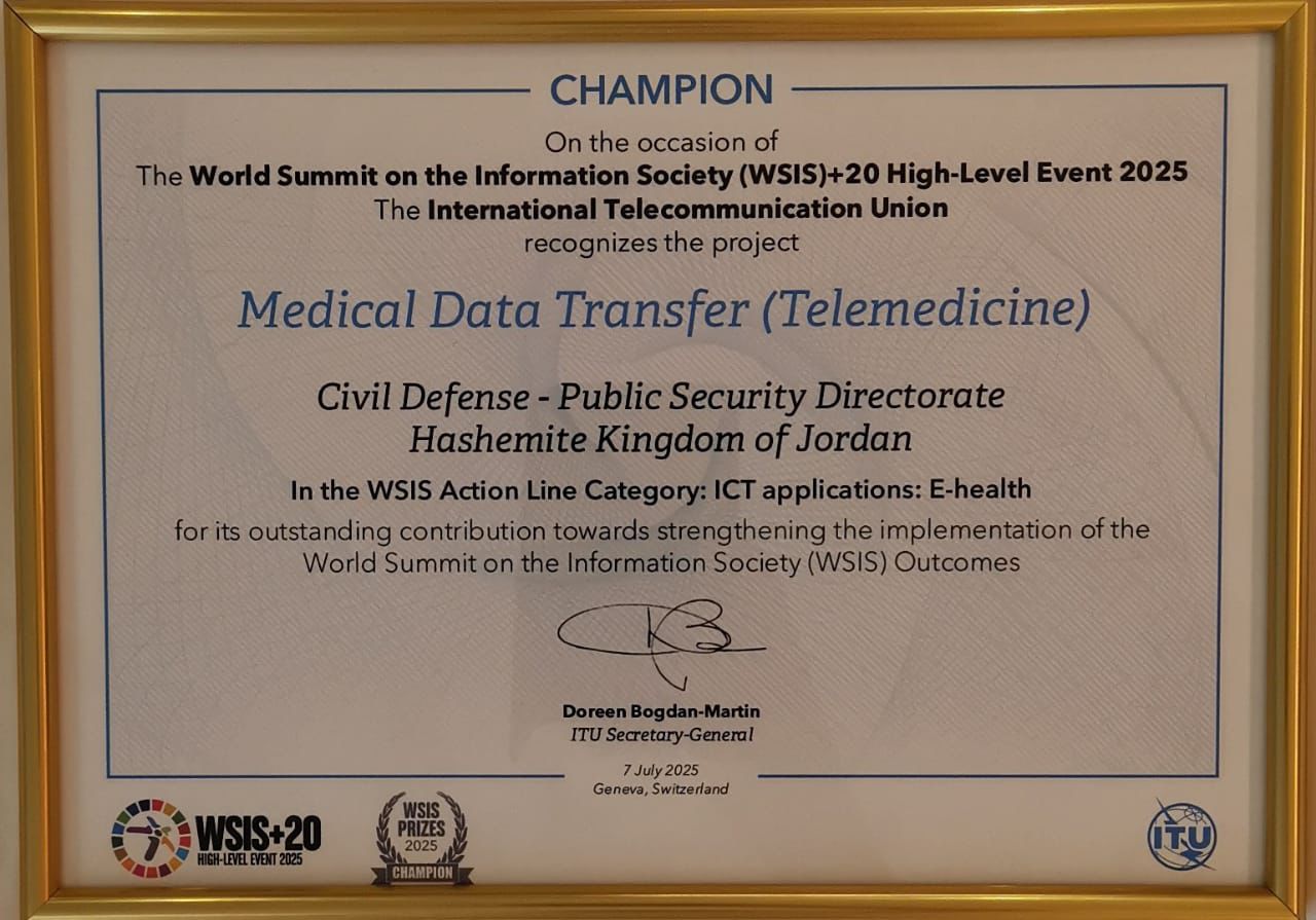 عمون - حصلت مديرية الدفاع المدني على جائزة القمة العالمية لمجتمع المعلومات (wsis prizes) عن مشروع التيلي ميدسن ( telemedicne )بوصفه أحد المشاريع الريادية ضمن محور الصحة الإلكترونية.