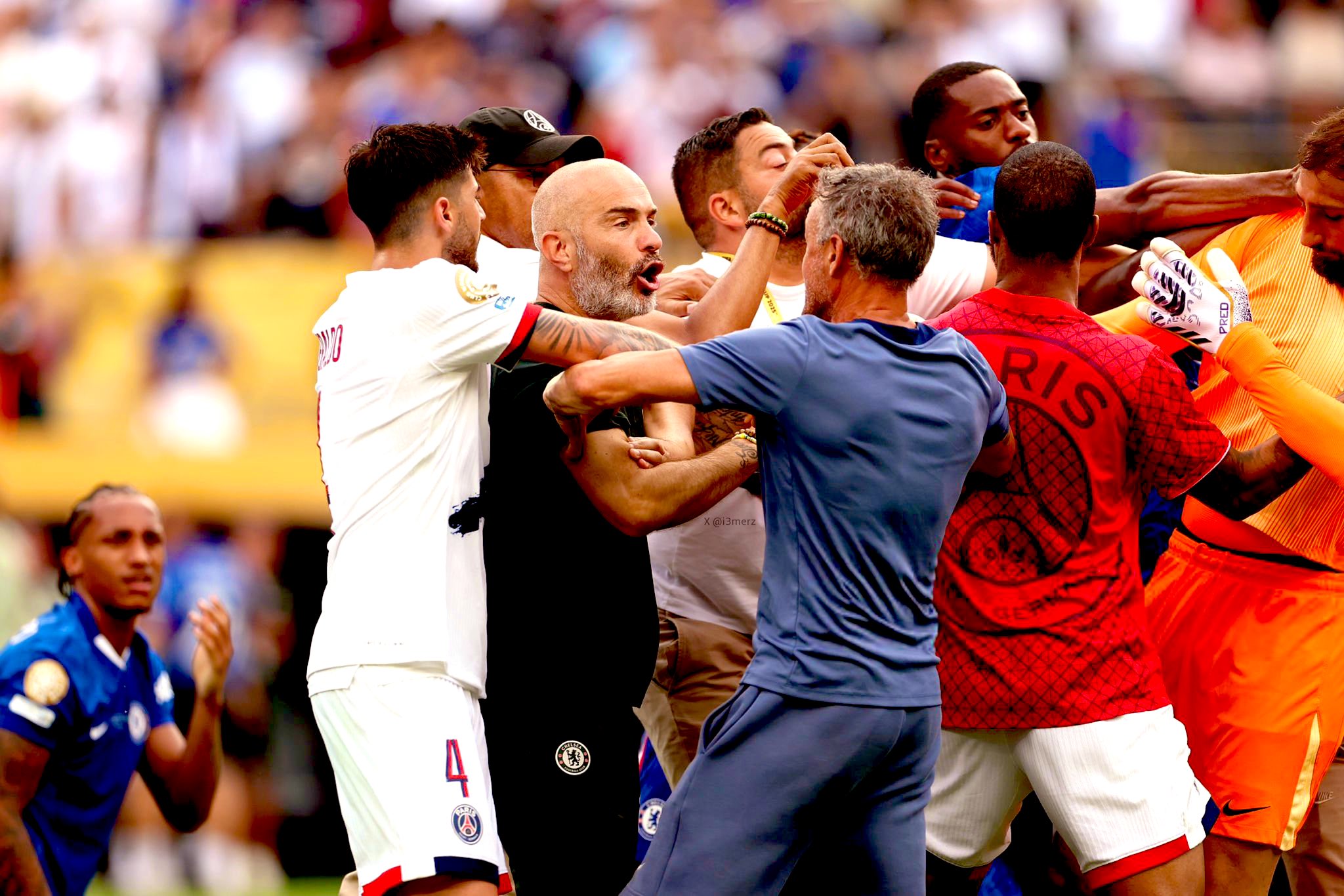 وتورط إنريكي في مشادة كلامية مع جواو بيدرو مهاجم تشيلسي، انتهت بدفعة من المدرب الإسباني في رقبة اللاعب البرازيلي الذي سقط أرضا، وسط المناوشات التي تزامنت مع نهاية المباراة.