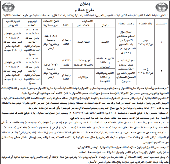 عطاء صادر عن القيادة العامة للقوات المسلحة الاردنية