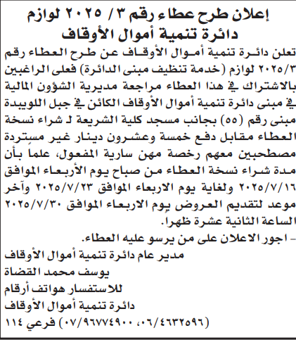 عطاء شراء خدمات التنظيف لدائرة تنمية أموال الايتام