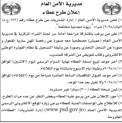 عطاء صادر عن مديرية الامن العام