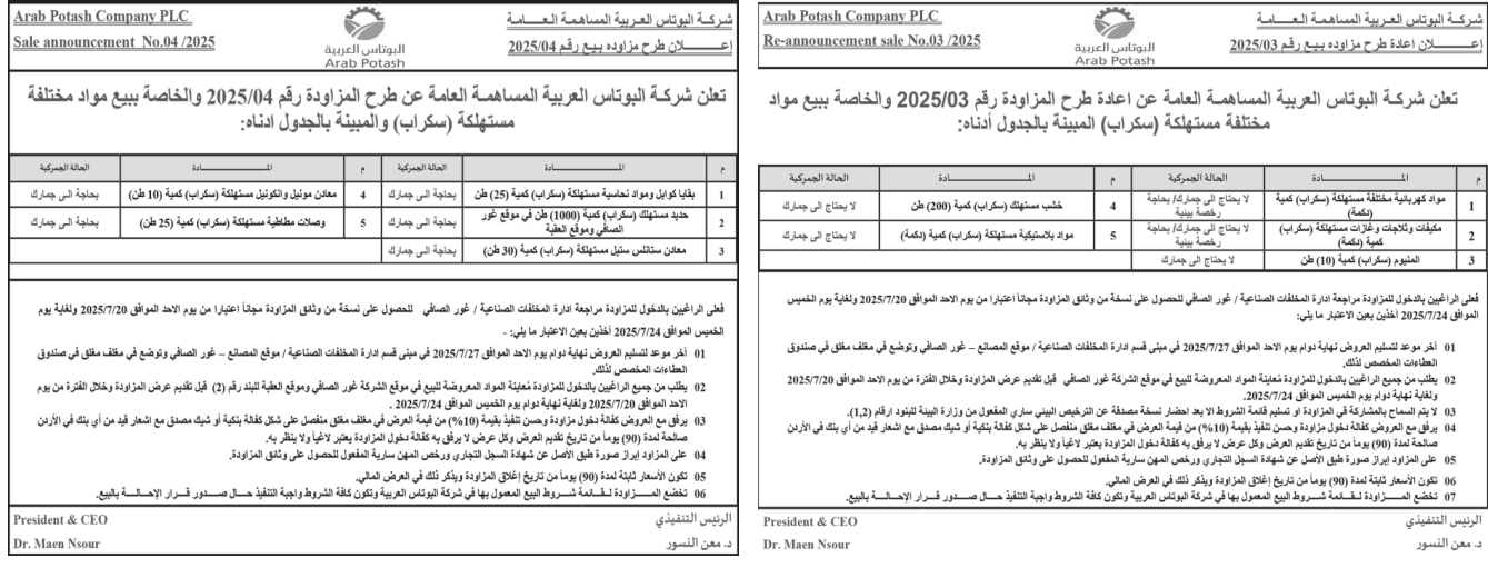 عطاءات صادرة عن شركة البوتاس العربية
