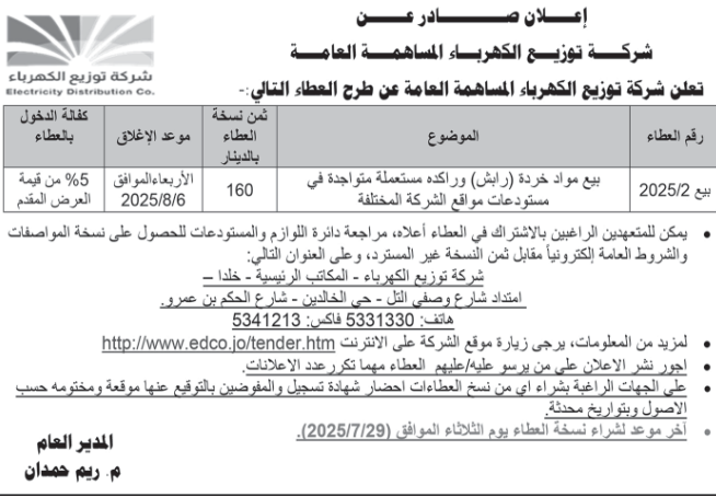 عطاء صادر عن شركة توزيع الكهرباء
