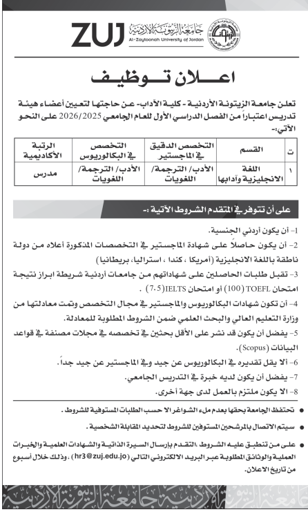 جامعة الزيتونة بحاجة لتعيين أعضاء هيئة تدريسية