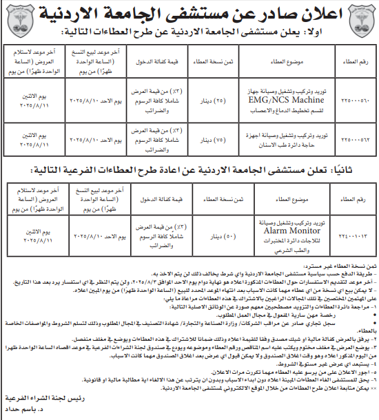 عطاءات صادرة عن مستشفى الجامعة الاردنية