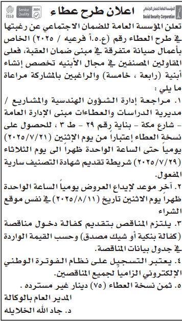 عطاء صادر عن المؤسسة العامة للضمان الاجتماعي