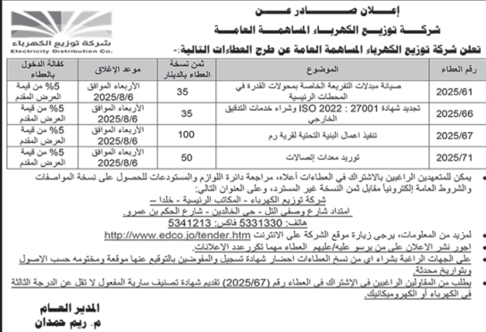 عطاءات صادرة عن شركة توزيع الكهرباء