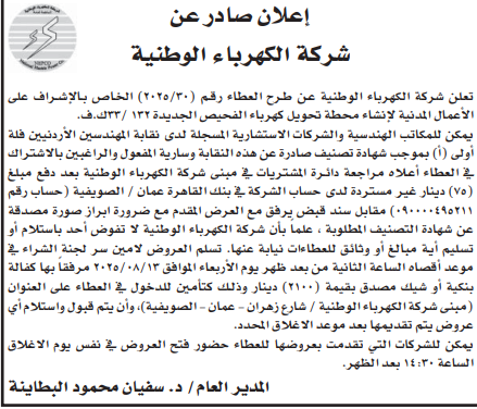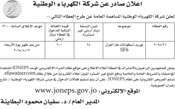 عطاءات صادرة عن شركة الكهرباء الوطنية