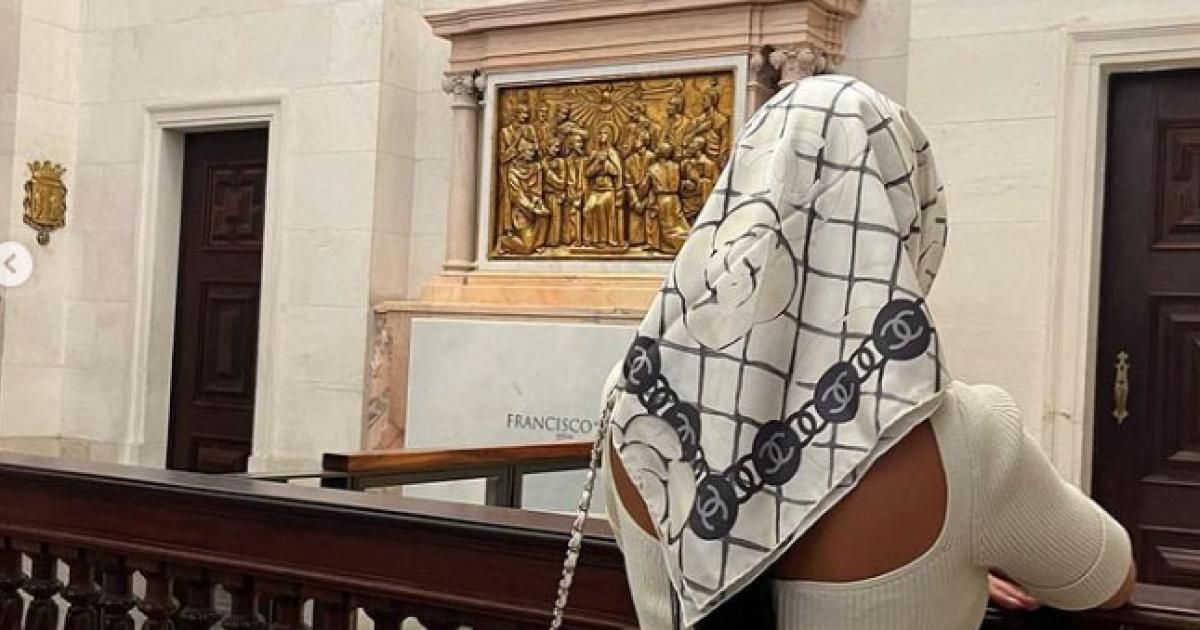 من بين المواقع التي زارتها كان دير Sanctuario de Fátima، الديني الشهير الذي يقع في بلدة فاتيما بالبرتغال. وهناك، اختارت جورجينا فستانًا أبيض طويلًا بطبعة ورود وقصة هالتر، صُمم بفتحات شفافة. وظهرت وهي تحمل باقة من الزهور البيضاء لتضعها على المذبح، ونسقت إطلالتها مع صندل إسبادريل بكعب منصة، وحقيبة بنية اللون، وقبعة غطت شعرها.