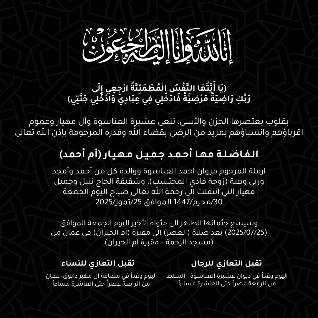 بسم الله الرحمن الرحيم ويقبل العزاء بديوان عشيرة العناسوة في السلط بمنطقة الخندق للرجال من ٤ عصرا لغاية ١٠،مساء يومي الجمعة والسبت، وللنساء بديوان آل مهيار الكائن في دابوق شارع الملك عبد الله الثاني خلف حلويات اغاتي، ويوم الاحد للرجال بمنزل العائلة.