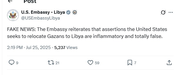 وقال البيان: "تؤكد السفارة (الأميركية لدى طرابلس) أن الادعاءات بأن الولايات المتحدة تسعى إلى نقل سكان غزة إلى ليبيا، هي ادعاءات تحريضية وكاذبة تماما".