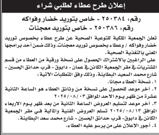 عطاء توريد خضار وفواكة للجمعية الملكية لتوعية الصحية