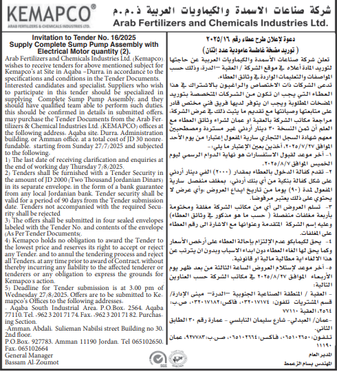 عطاء صادر عن شركة صناعات الاسمدة والكيماويات العربية