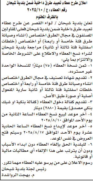 عطاء تعبيد طرق داخلية ضمن بلدية شيحان