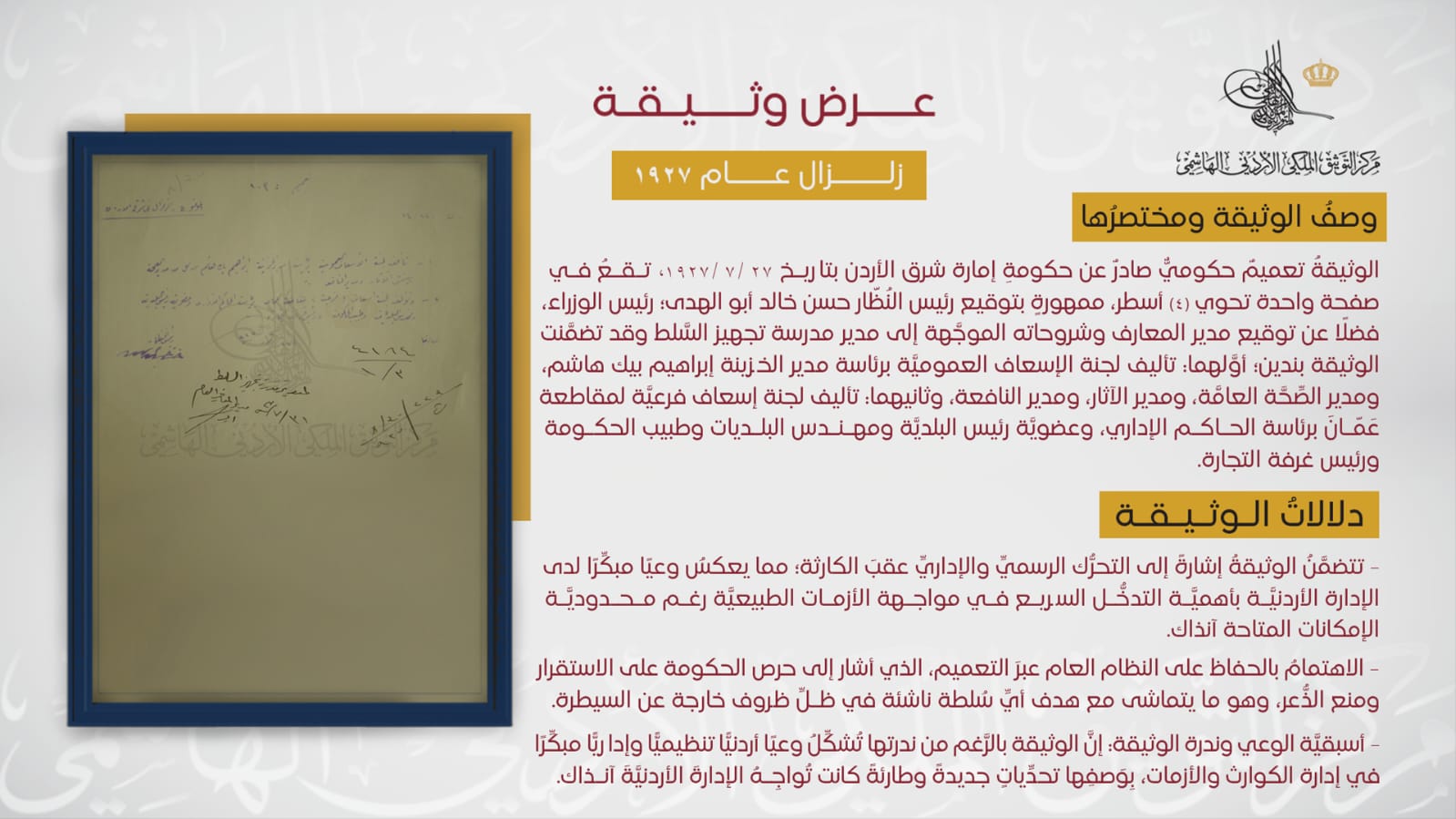 التوثيق الملكي يعرض وثيقة حول "زلزال نابلس"27-07-2025 11:32 AM