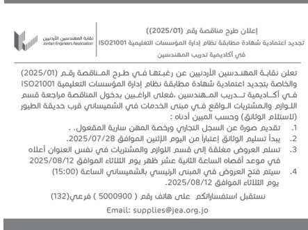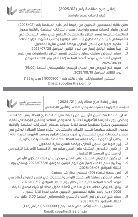 عطاءات صادرة عن نقابة المهندسين الاردنيين