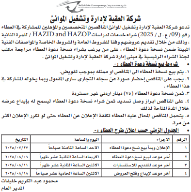 عطاء صادر عن شركة العقبة لادارة وتشغيل الموانئ