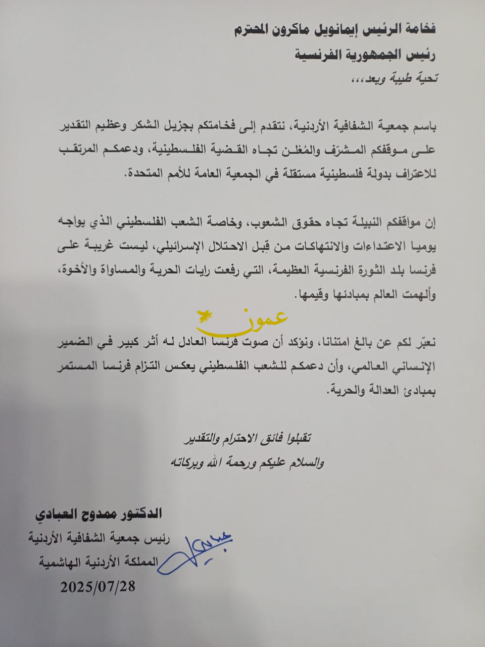 باسم جمعية الشفافية الأردنية، نتقدم إلى فخامتكم بجزيل الشكر وعظيم التقدير على موقفكم المشرف والمعلن تجاه القضية الفلسطينية، ودعمكم المرتقب للاعتراف بدولة فلسطينية مستقلة في الجمعية العامة للأمم المتحدة.