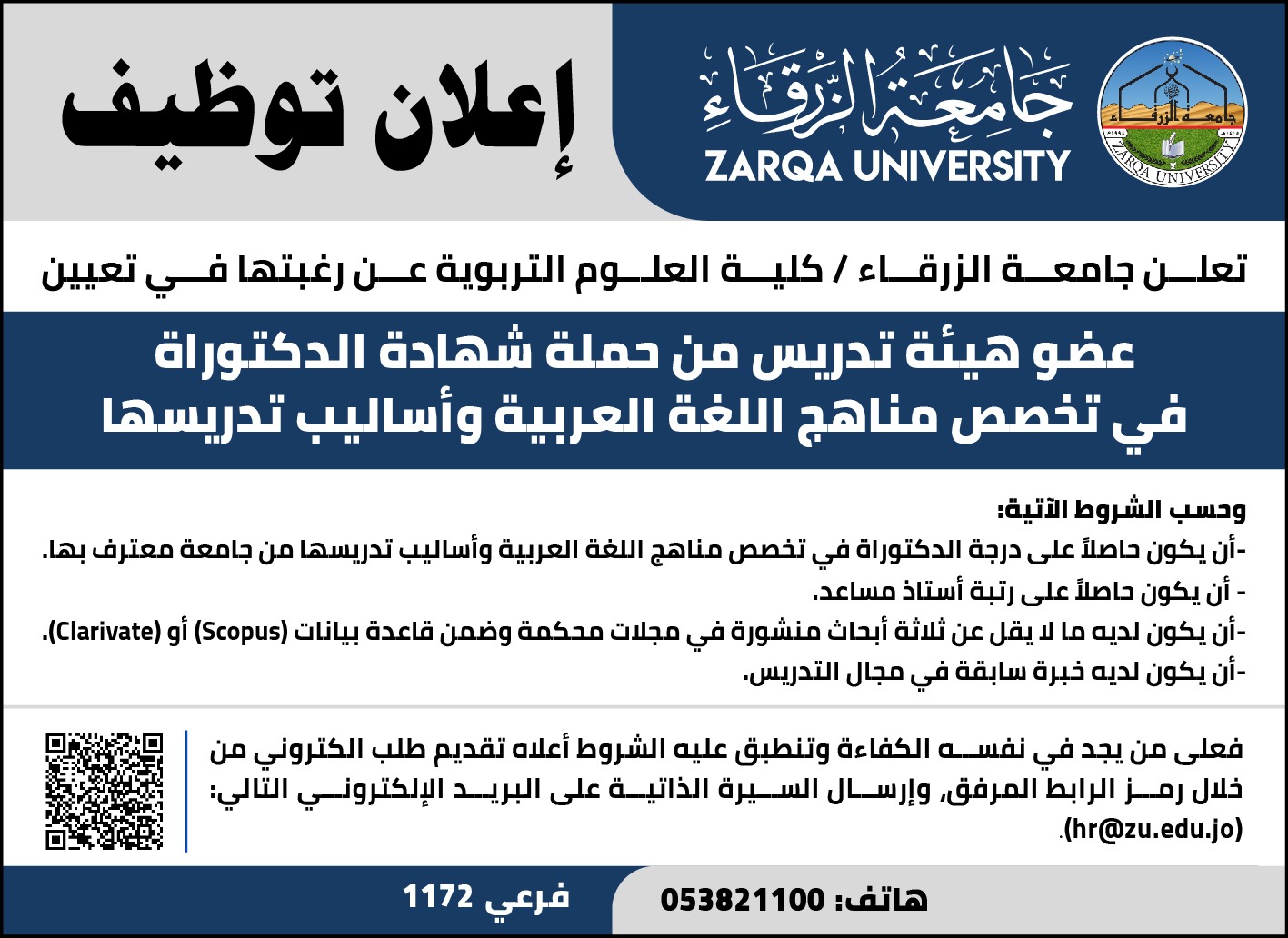جامعة الزرقاء بحاجة لتعيين عضو هيئة تدريسية