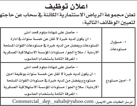 مطلوب امين مستودع للعمل لدى مجموعة الرياض الاستثمارية