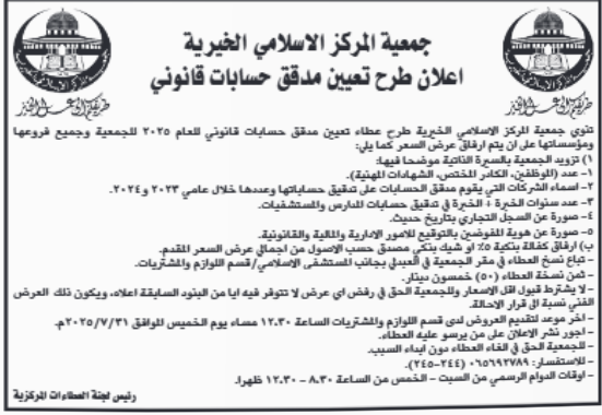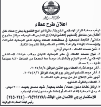 عطاءات صادرة عن جمعية المركز الاسلامي الخيرية
