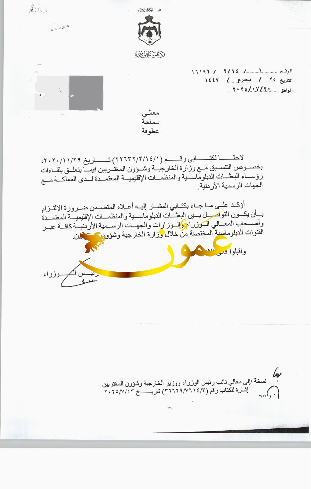 عمون - من ينال المعاني- أكد رئيس الوزراء الدكتور جعفر حسان على ضرورة الالتزام بان يكون التواصل بين البعثات الدبلوماسية والمنظمات الإقليمية المعتمدة والوزراء والوزارات والجهات الرسمية الاردنية كافة عبر القتوات الدبلوماسية المختصة من خلال وزارة الخارجية وشؤون المغتربين. |