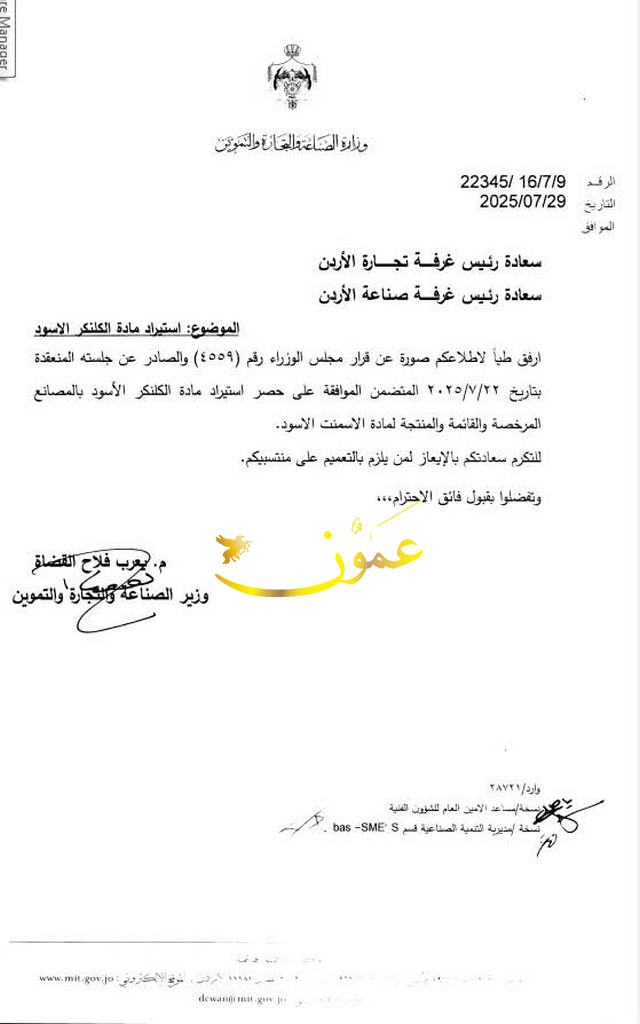 الحكومة توافق على حصر استيراد مادة الكلنكر في مصانع الاسمنت الاسود30-07-2025 06:32 PM