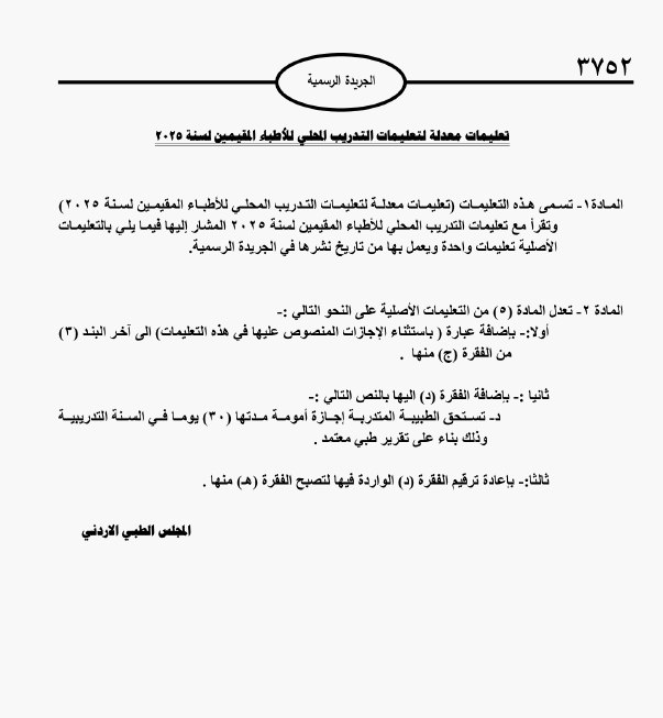 عمون - صدرت في الجريدة الرسمية، اليوم الخميس، تعليمات معدلة لتعليمات التدريب المحلي للأطباء المقيمين لسنة 2025، تمنح الطبيبة المتدربة إجازة أمومة مدتها 30 يومًا. |