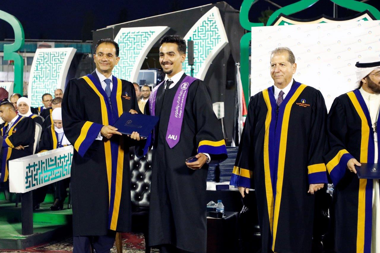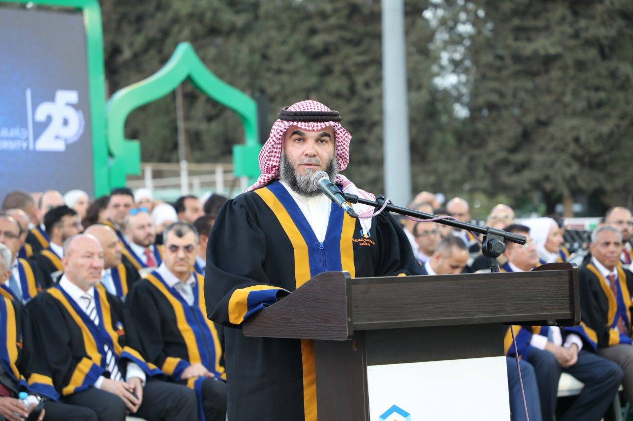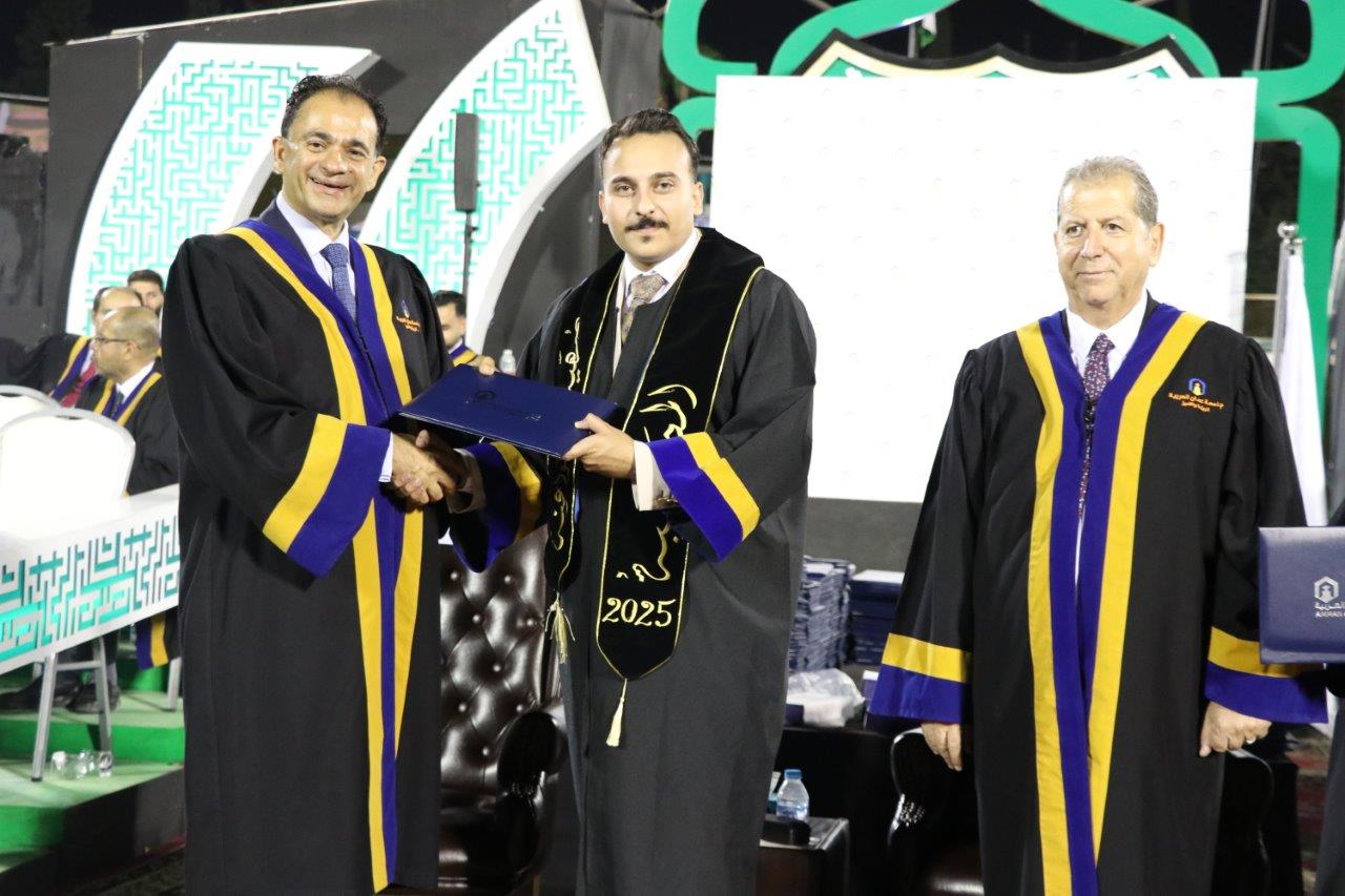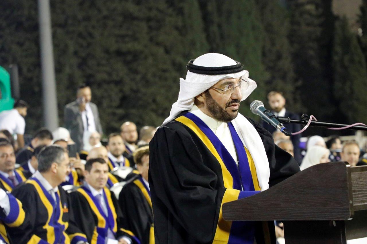 وأكد الوديان أن هذه الإنجازات لم تكن لتتحقق لولا الدعم المتواصل من هيئة المديرين ومجلس الأمناء، مشيداً بحضور المهندس أحمد الخالد رئيس هيئة المديرين من دولة الكويت الشقيقة، والدكتور محمد الأنصاري عضو مجلس الأمناء من دولة قطر الشقيقة، كما توجه بالتهنئة إلى الطلبة وذويهم، داعياً الخريجين إلى أن يكونوا أدوات بناء وعمل وسفراء لجامعتهم يحملون رسالتها وقيمها في كل مكان.