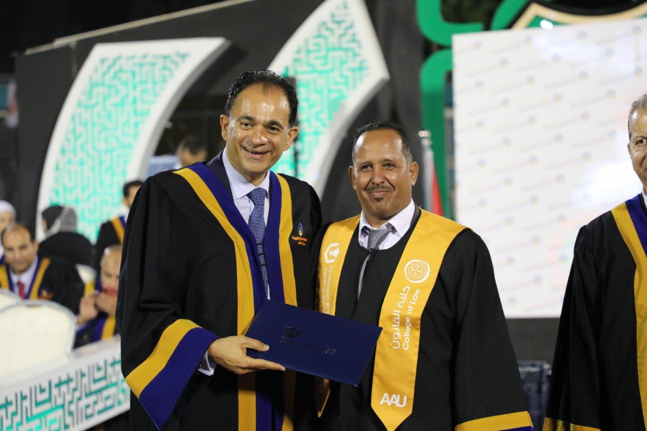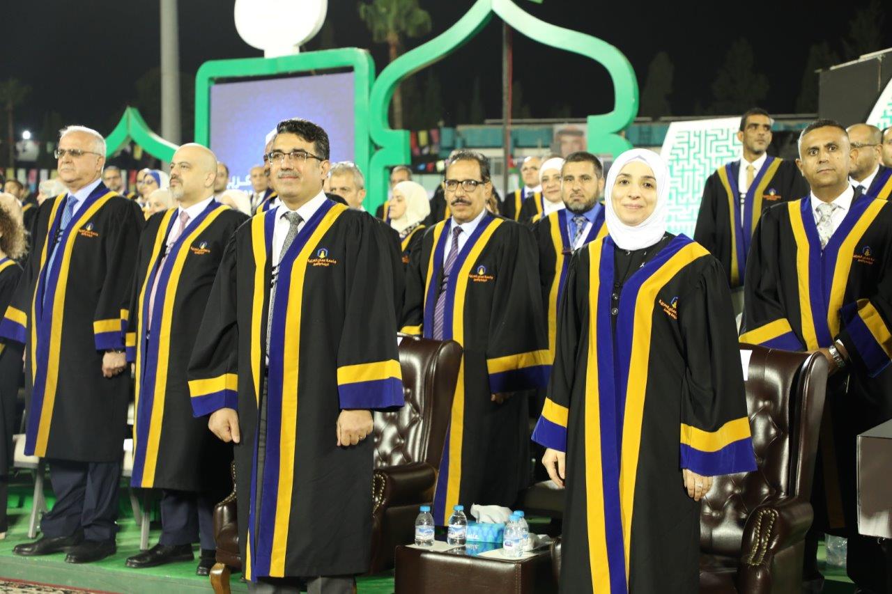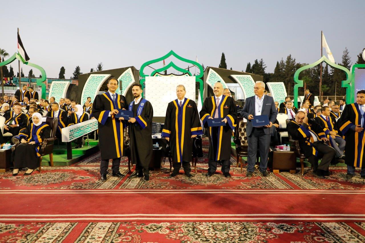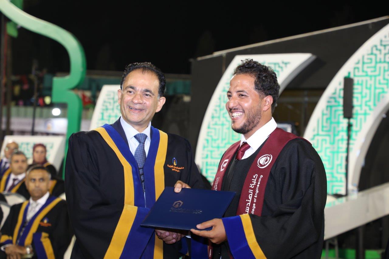 وفي ختام الحفل الذي كان عريفه خريج الجامعة السيد عبد الرحمن سلامة، قام الدكتور عمر الجازي والدكتور محمد الوديان بتسليم الشهادات على الطلبة الخريجين بالإضافة إلى الجوائز التقديرية على الطلبة الأوائل.