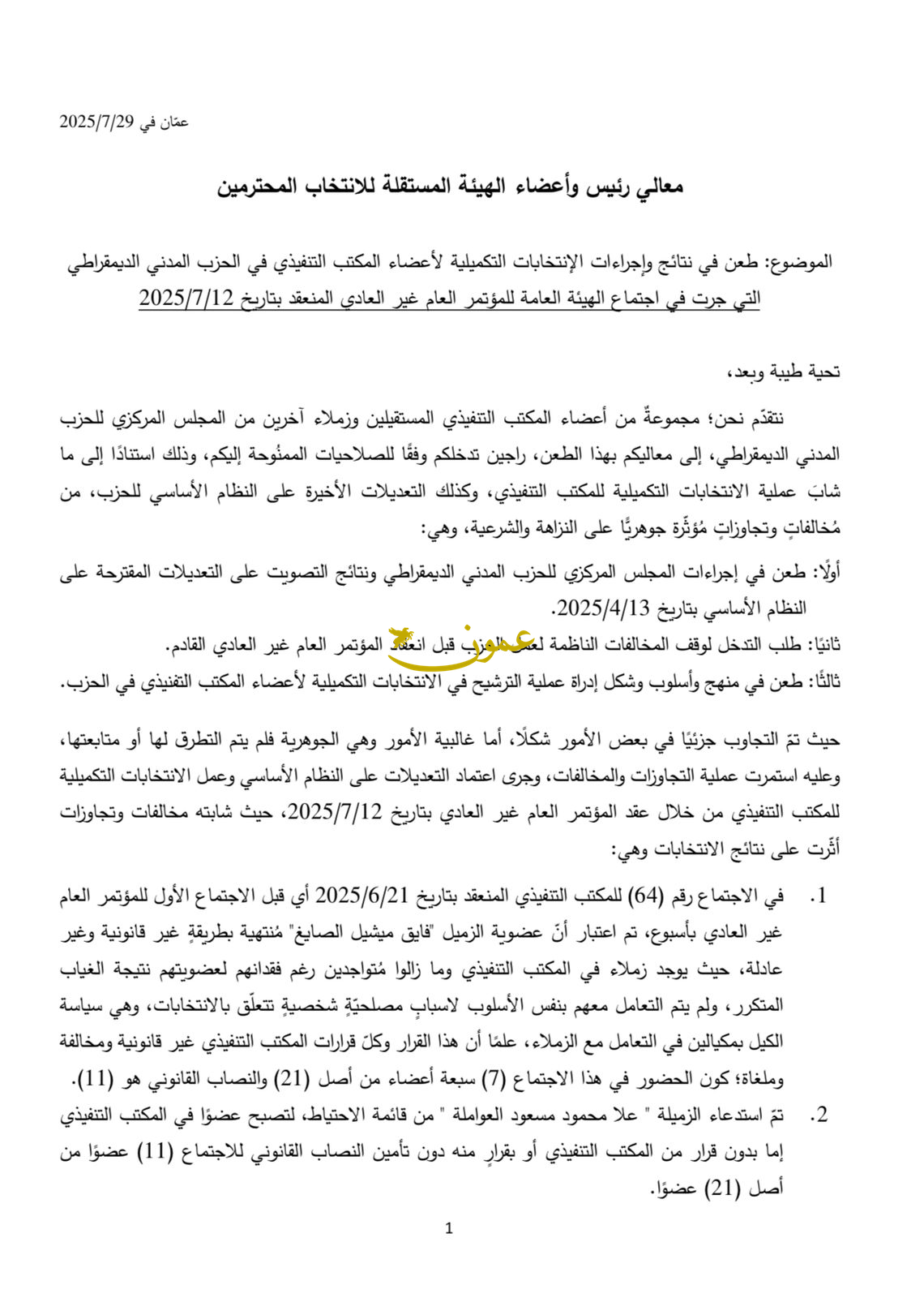 عمون - في تطور خطير يعصف بالحياة الحزبية، تقدّم عدد من أعضاء المكتب التنفيذي المستقيلين في الحزب المدني الديمقراطي، بمساندة شخصيات من المجلس المركزي، بطعن رسمي يوم الخميس الماضي الموافق 2025/7/31 إلى الهيئة المستقلة للانتخاب، طالبوا فيه بوقف ما وصفوه بـ"انتهاكات صارخة ومخالفات جسيمة" شابت الانتخابات التكميلية للمكتب التنفيذي والتعديلات الأخيرة على النظام الأساسي، التي أُقرت في المؤتمر العام غير العادي بتاريخ 12 تموز 2025.