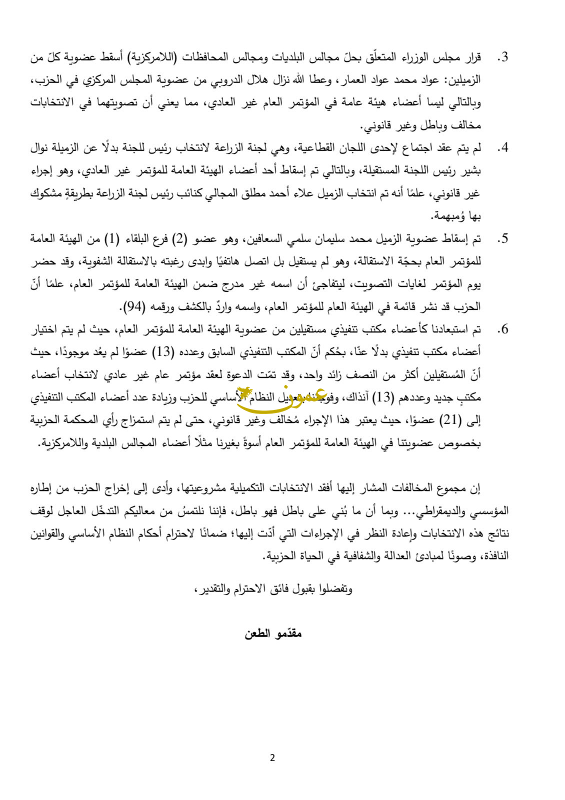 وقال مقدمو الطعن إن ما جرى لا يرقى إلى مجرد خلل إجرائي، بل يشكّل "مخططًا محكمًا لإقصاء الأصوات المعارضة وتفريغ الحزب من مضمونه الديمقراطي"، مؤكدين أن النتائج "مزوّرة الإرادة، وفاقدة الشرعية القانونية والتنظيمية" حسب قولهم.