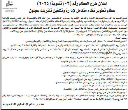 عطاء صادر عن الاردنية للمناطق الحرة التنموية