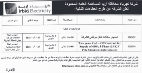 عطاء استئجار حافلات لنقل موظفي شركة كهرباء اربد