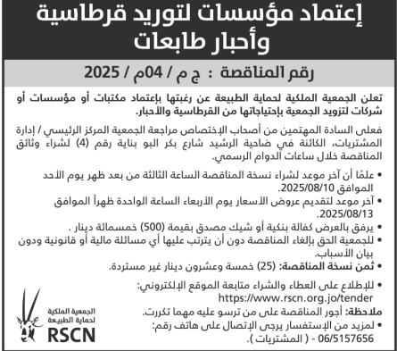 عطاء شراء قرطاسية واخبار طابعات للجمعية الملكية لحماية الطبيعة