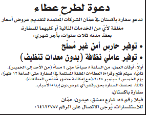 عطاء تقديم عروض اسعار لتوفير حارس امن وعاملي نظافة لسفارة الباكستان