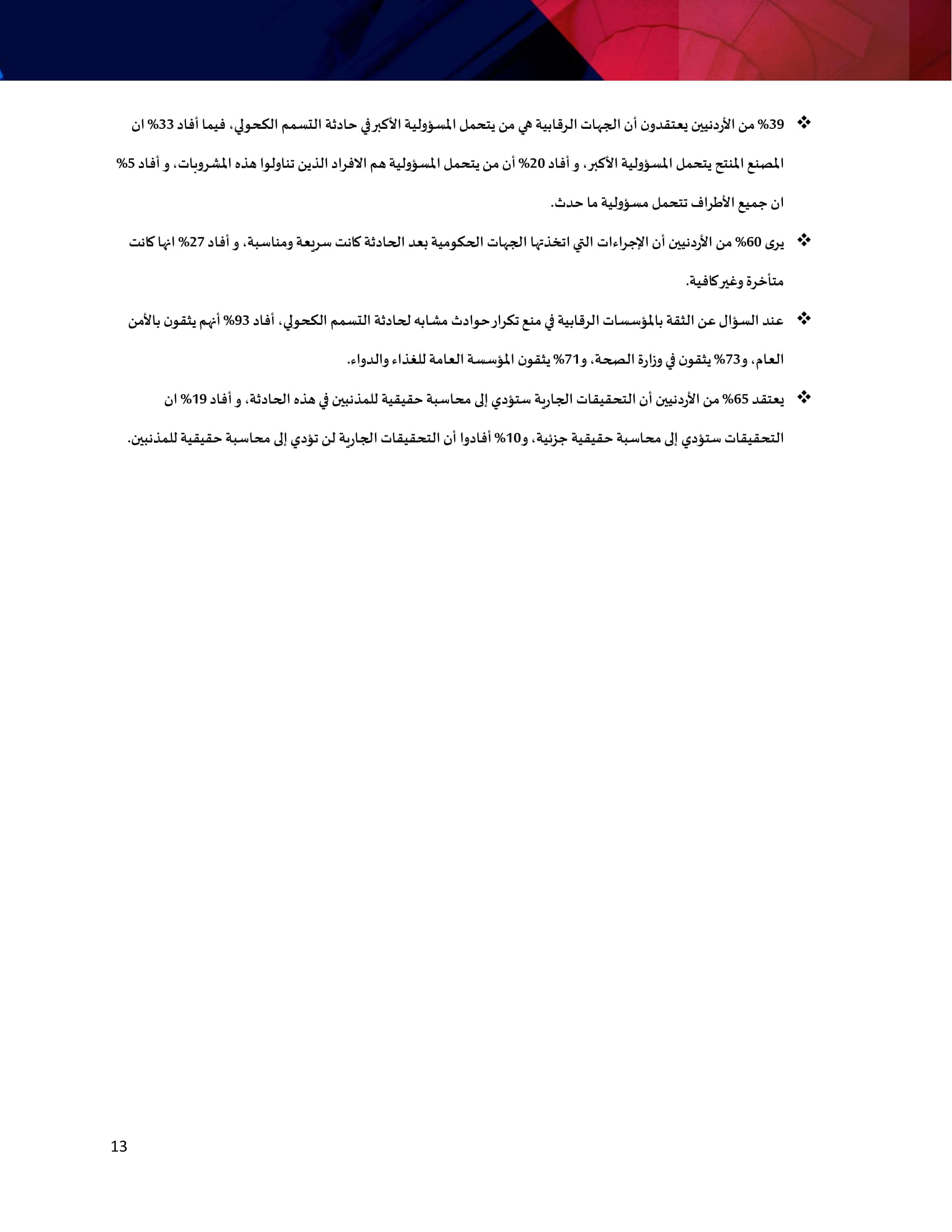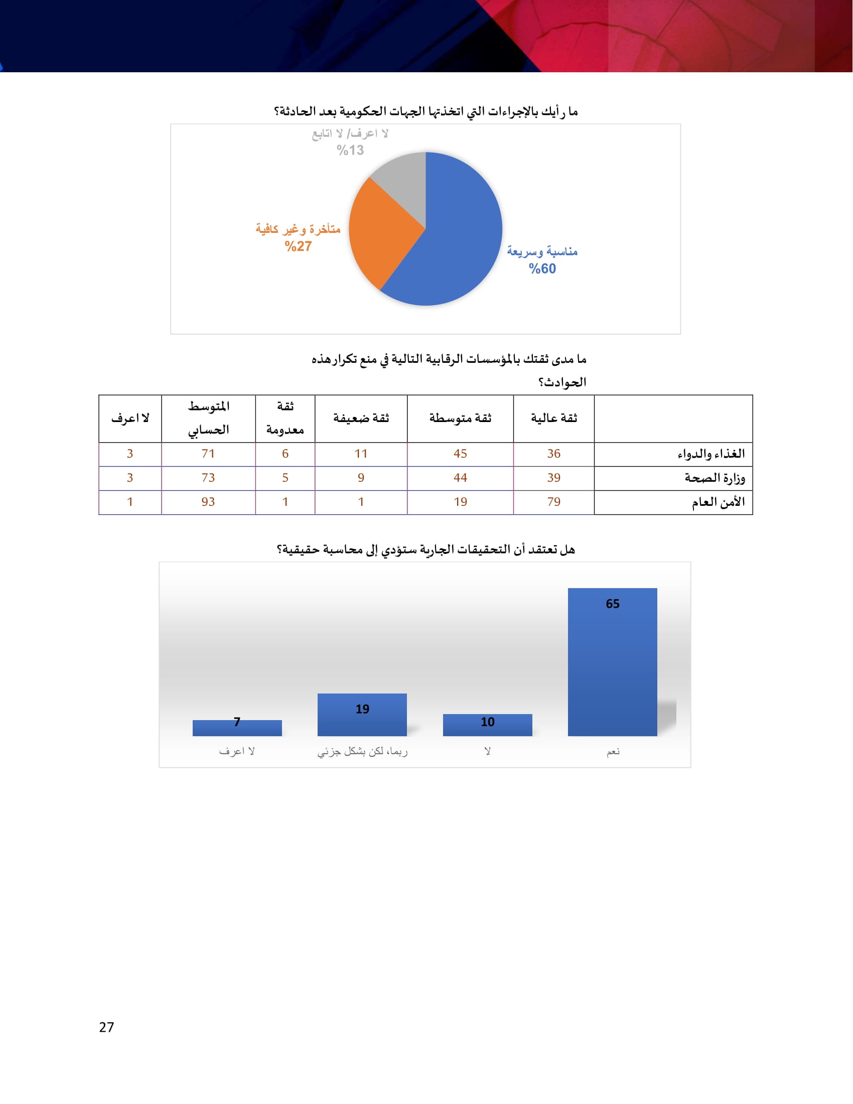 وعبر 93% من أفراد العينة المستجيبة عن ثقتهم بالمؤسسات الرقابية في منع تكرار حوادث مشابهة لحادثة التسمم الكحولي، منهم 93% يثقون بالأمن العام، و73% يثقون بوزارة الصحة، و71% يثقون بالمؤسسة العامة للغذاء والدواء.
