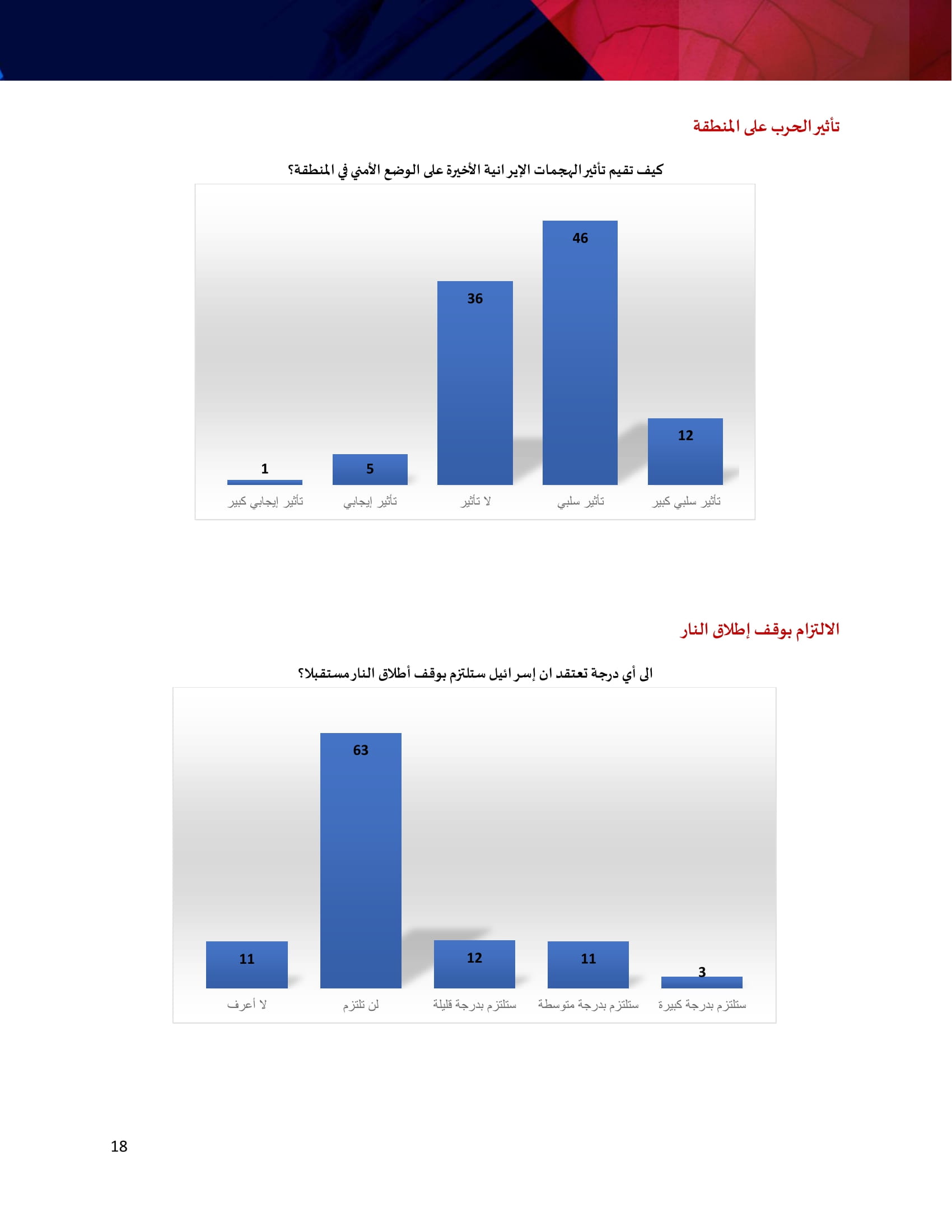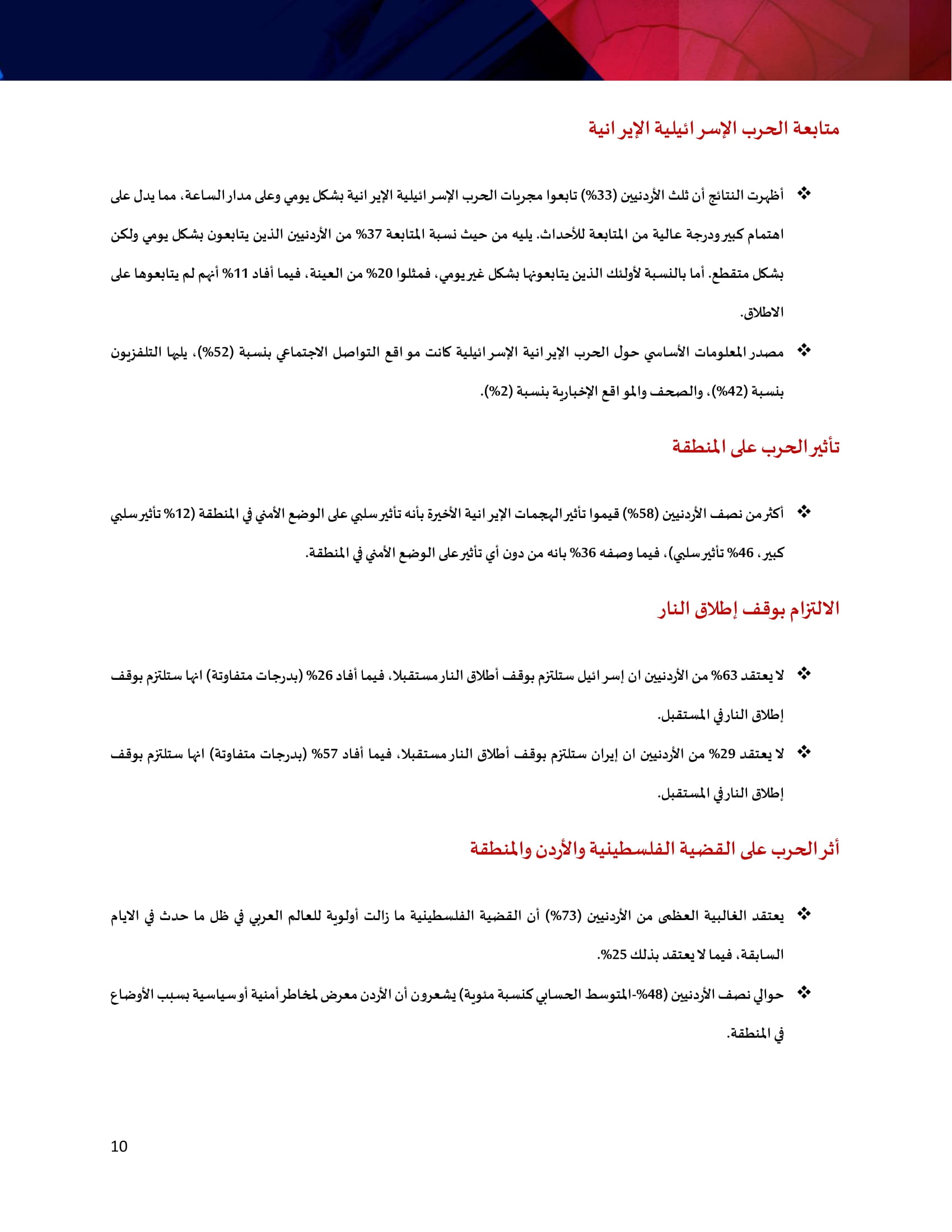 وفيما يتعلق بالنزاع الإيراني - الإسرائيلي، فإن 70% من الأردنيين يؤيدون وقف إطلاق النار الذي جرى بين الجانبين، ويقيم أكثر من نصف الأردنيين (58%) تأثير الهجمات الأخيرة بأنه سلبي على الوضع الأمني في المنطقة، و36% يرون أنه دون أي تأثير.