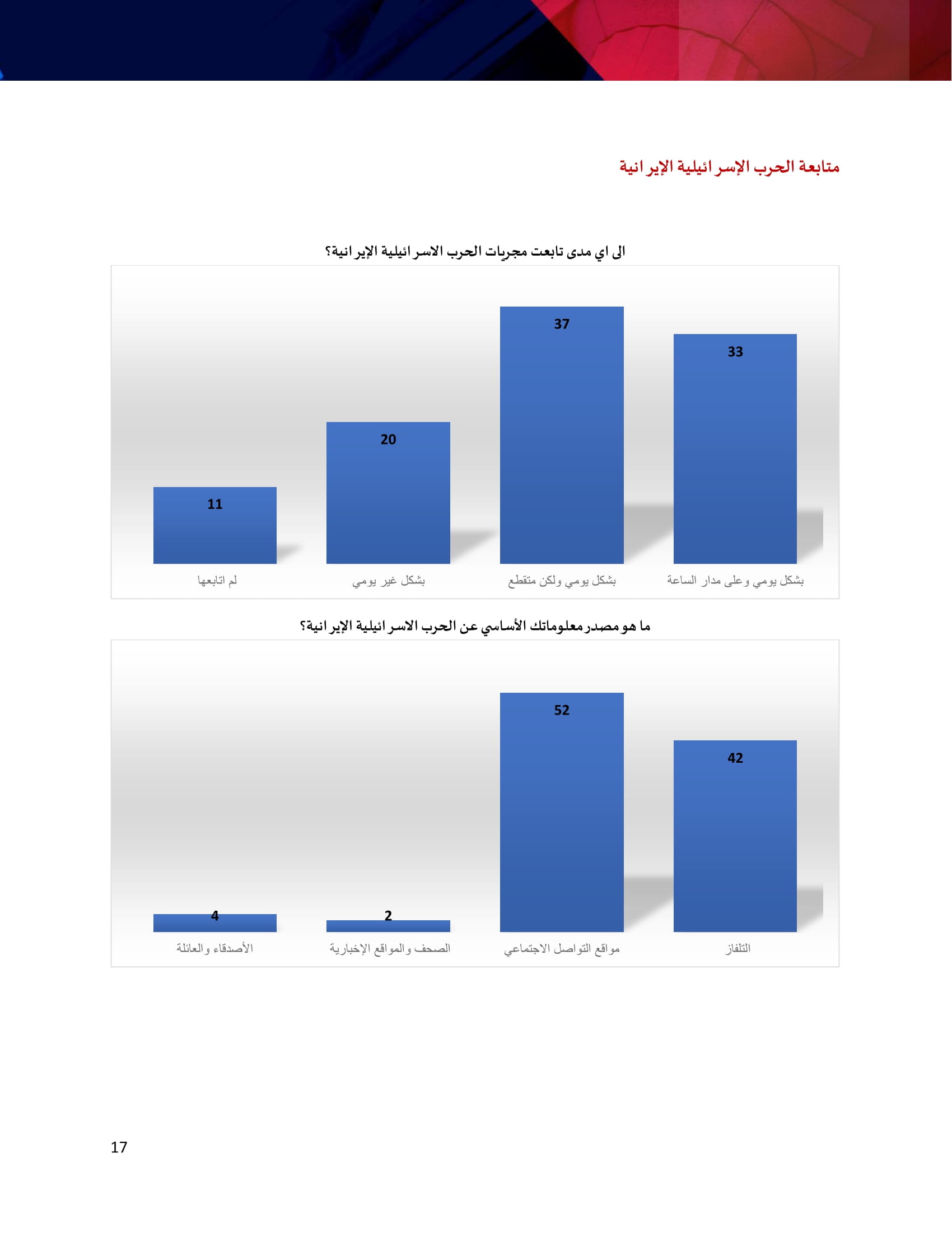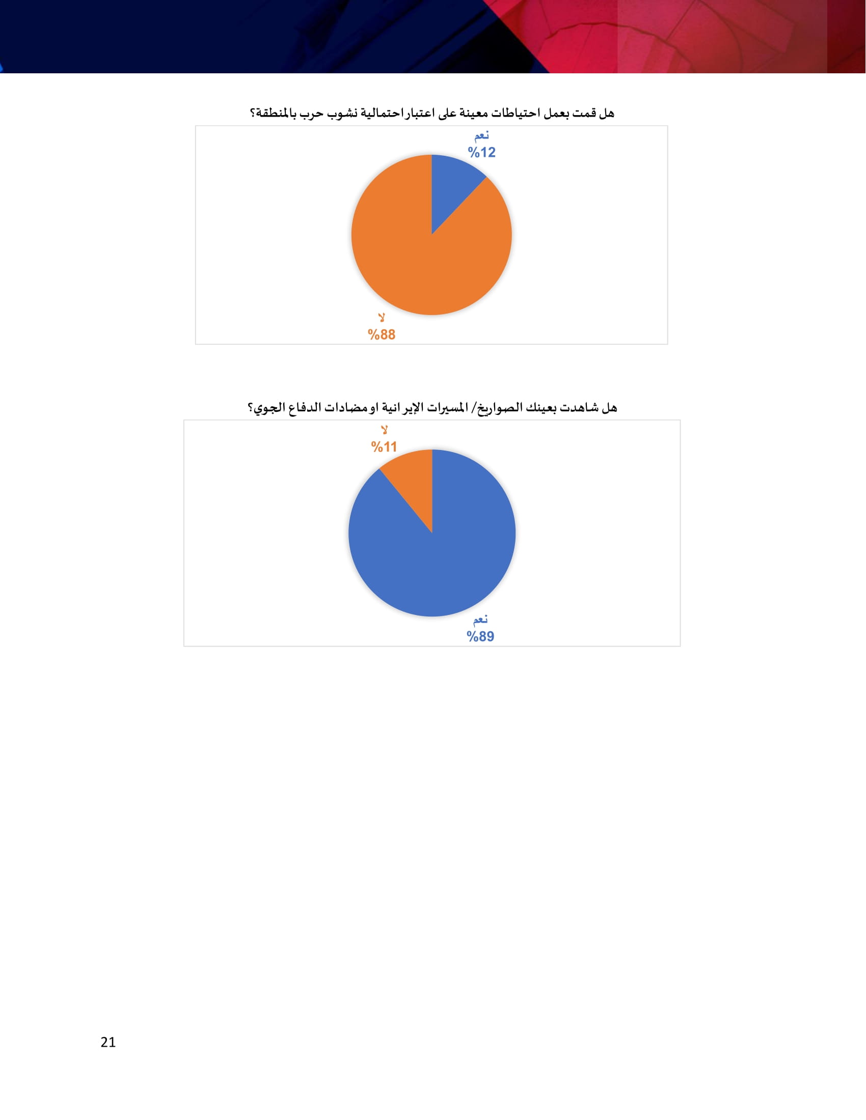 وأظهرت الدراسة كذلك أن 62% التزموا بالتعليمات الواجب تنفيذها عند سماع صافرات الإنذار، فيما لم يلتزم بذلك 38% من الأردنيين. كما أن 12% من الأردنيين قاموا بعمل احتياطات معينة على اعتبار احتمالية نشوب حرب بالمنطقة، فيما لم يقم بأي احتياطات 88% من الأردنيين، فيما أفاد 89% أنهم شاهدوا بأعينهم الصواريخ والمسيرات الإيرانية أو مضادات الدفاع الجوي، فيما لم يشاهدها 11% من الأردنيين.