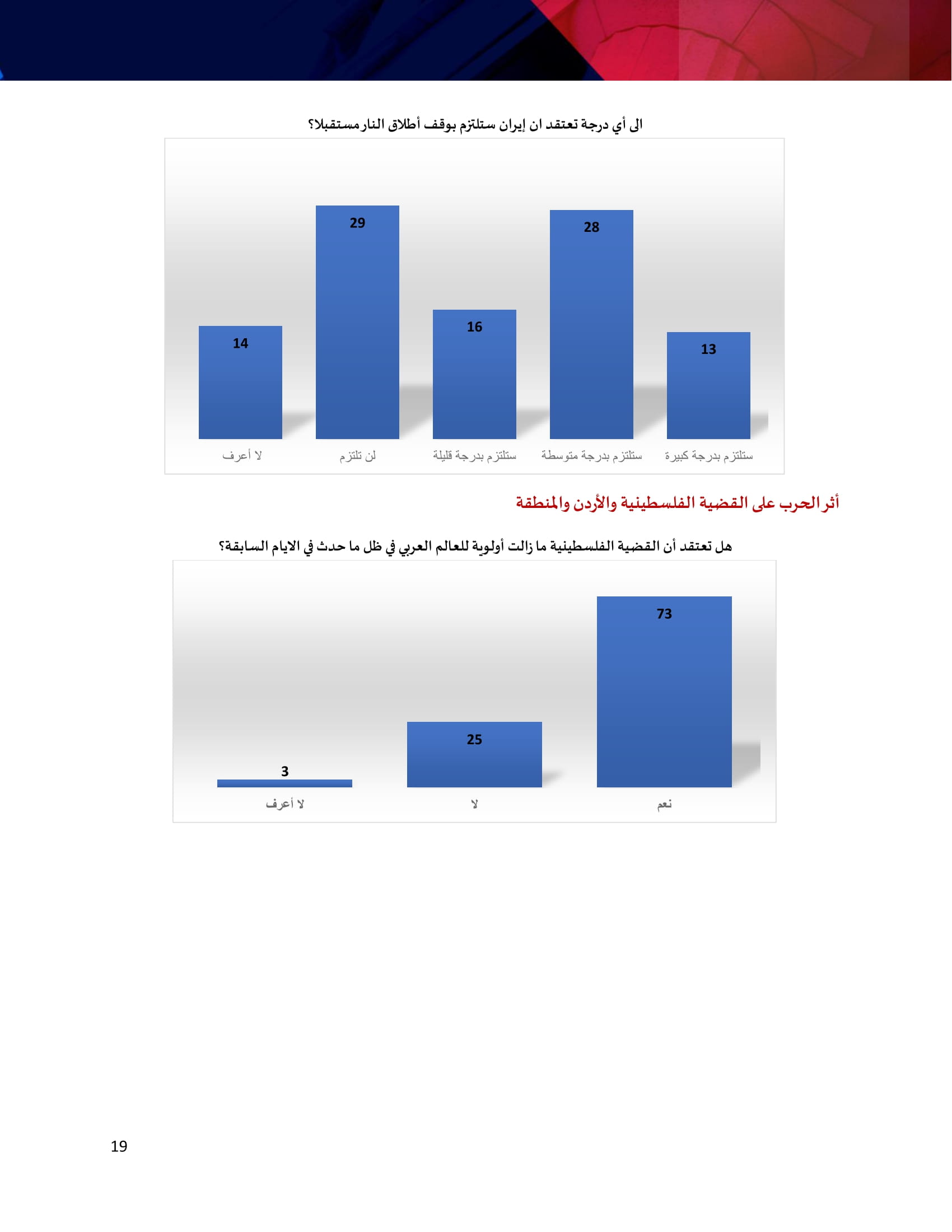 وكشف الاستطلاع أن 73% من الأردنيين يعتقدون أن القضية الفلسطينية ما زالت أولوية للعالم العربي في ظل ما حدث في الأيام الأخيرة.