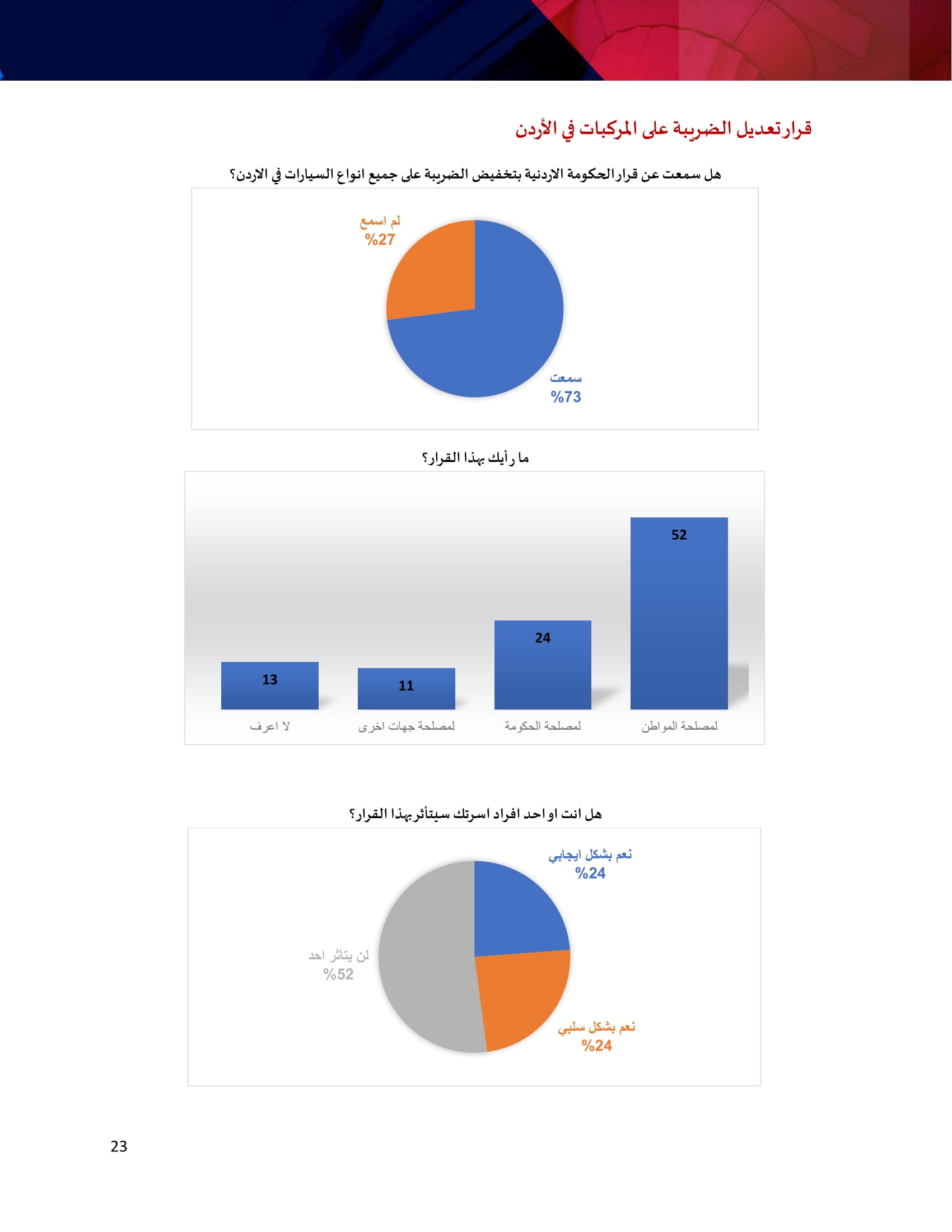 وفيما يتعلق بقرار الحكومة بتخفيض الضريبة على أنواع من سيارات الركوب، أفاد الاستطلاع أن 72% من الأردنيين سمعوا عن هذا القرار، وأن 52% ممن سمعوا عنه يعتقدون أنه جاء لمصلحة المواطنين، فيما يعتقد 24% أنه جاء لمصلحة الحكومة.